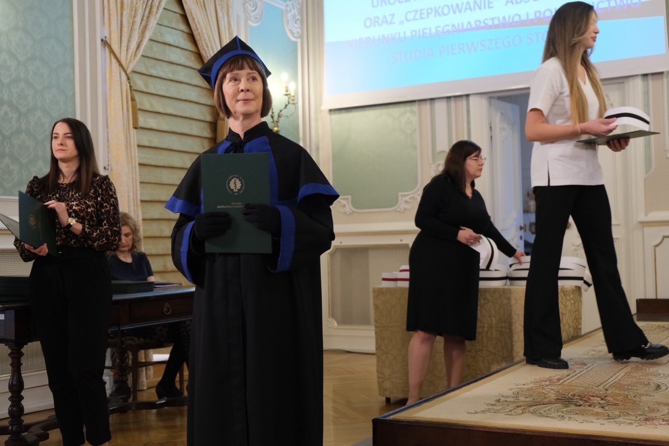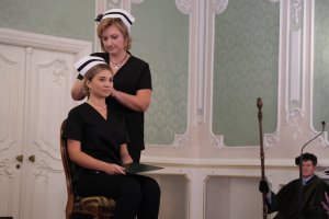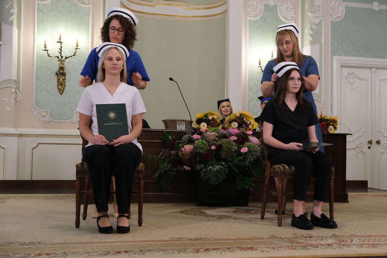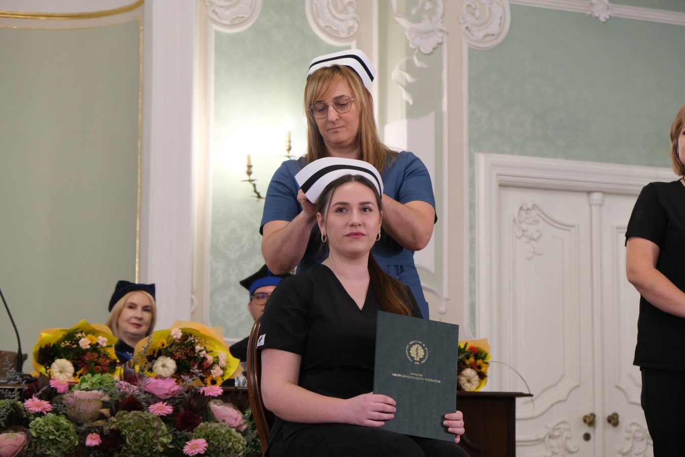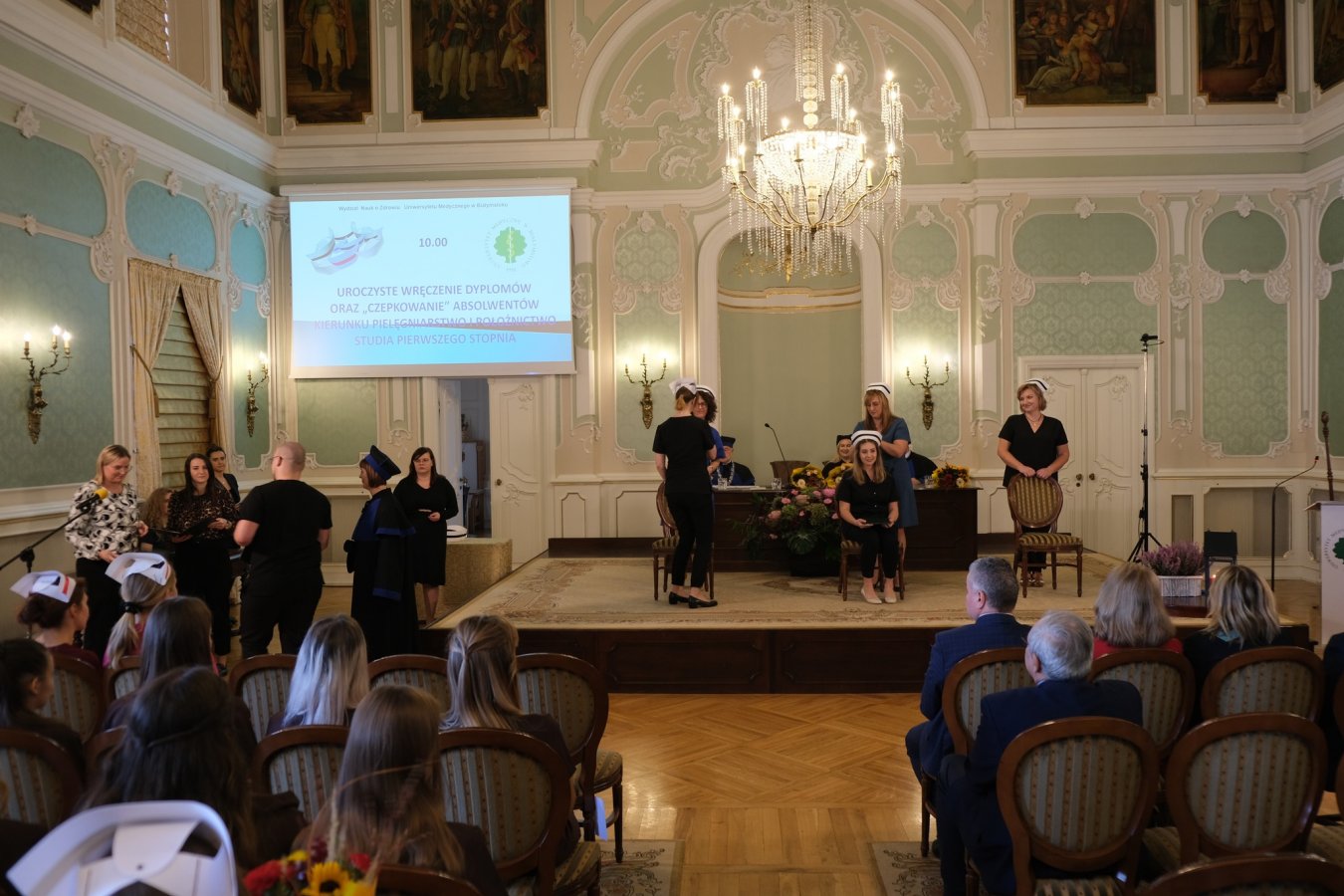 Prodziekan ds. Studenckich, prof. Ludmiła Marcinowicz, wręczała dyplomy, a opiekunowie kierunków pielęgniarstwa (dr Anna Baranowska, dr Agata Kulikowska, dr Agata Sacharewicz) i położnictwa (mgr Marta Zahor i dr Karolina Lisowska) przypinali absolwentom symboliczne czepki. Ceremonia odbywała się z dużą dbałością o tradycje akademickie – absolwenci kolejno kłaniali się w kierunku sztandaru oraz publiczności, odbierali dyplomy, a opiekunowie kierunków przypinali im symboliczne czepki.Absolwenci pielęgniarstwa i położnictwa na UMB - kwalifikacje