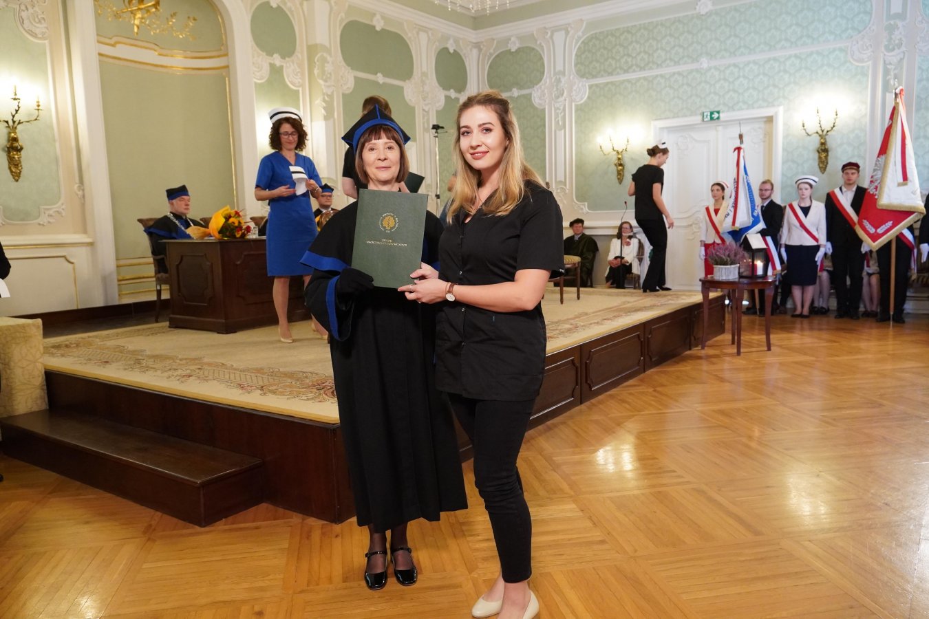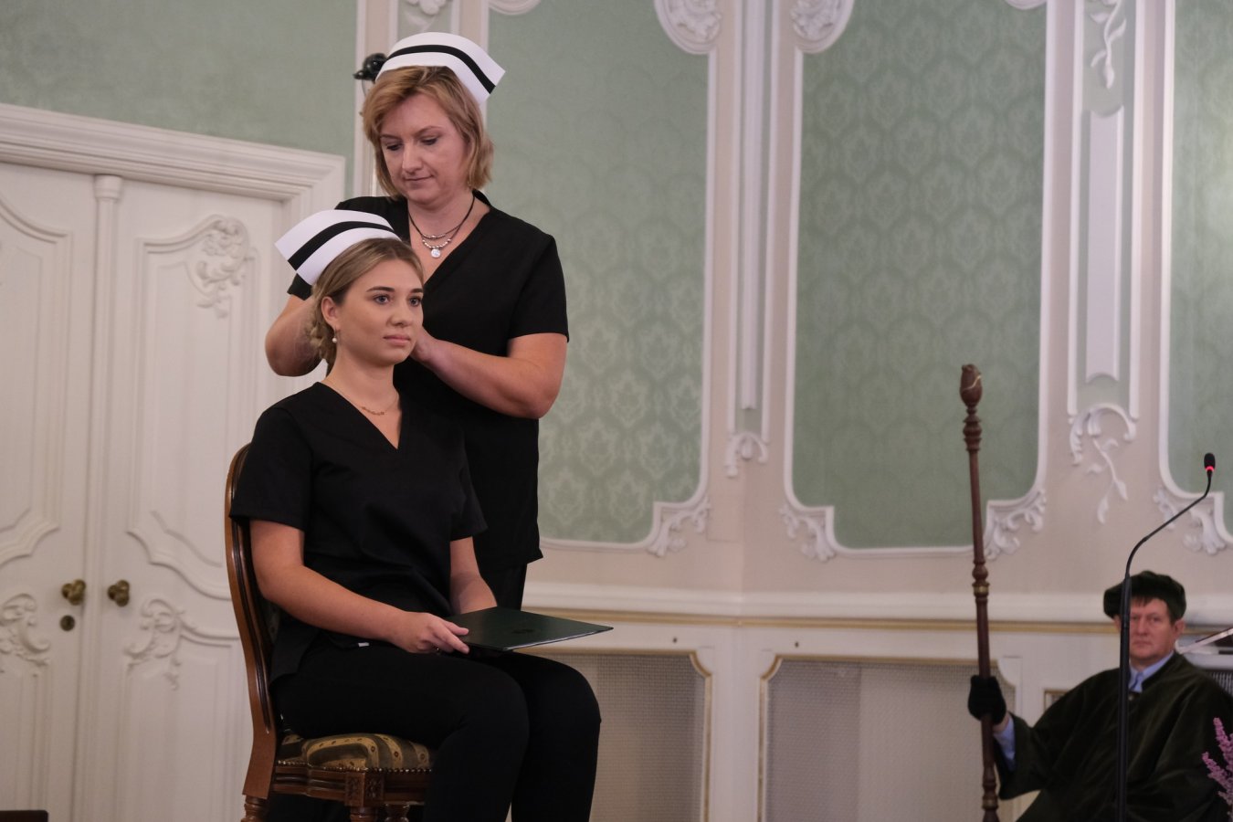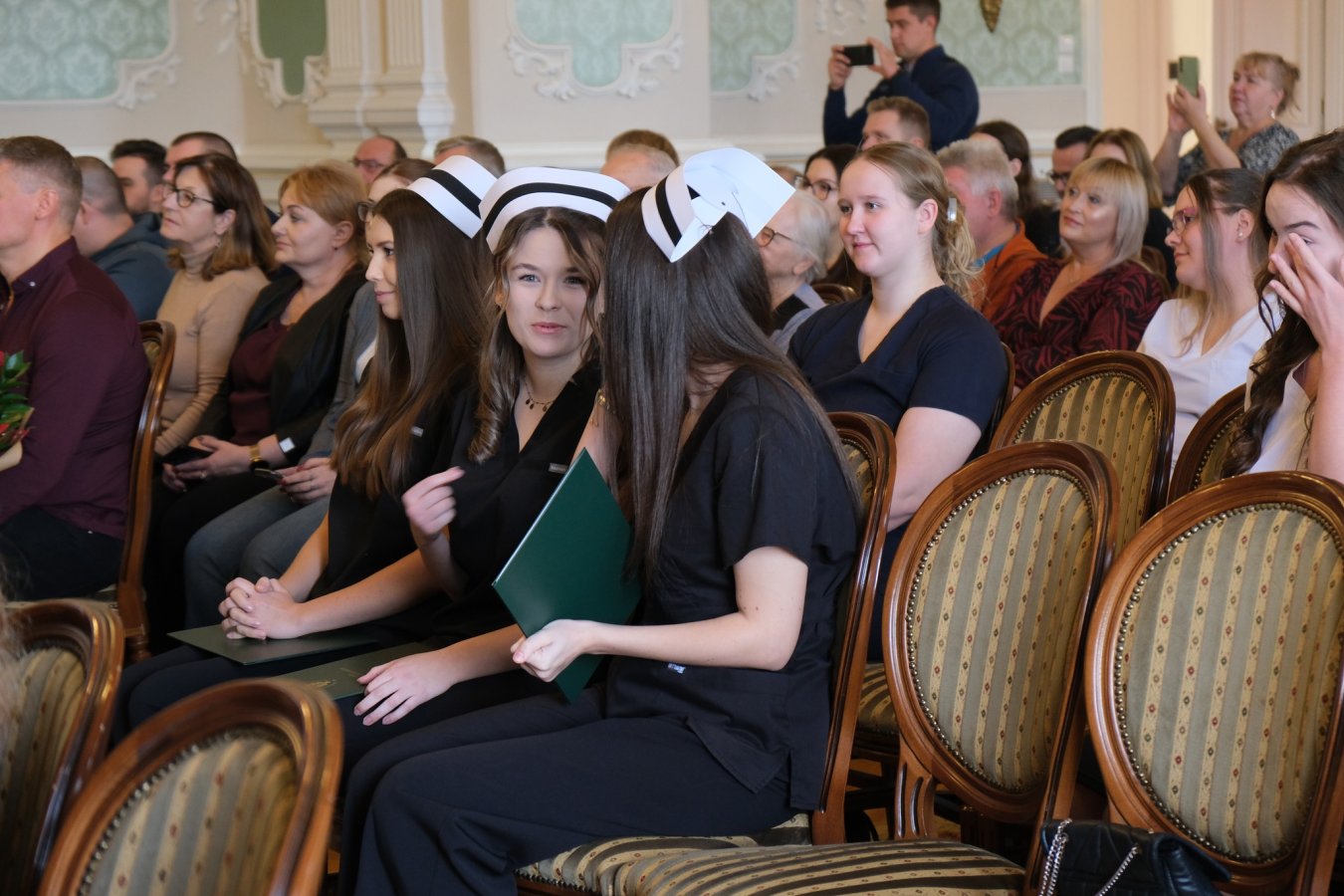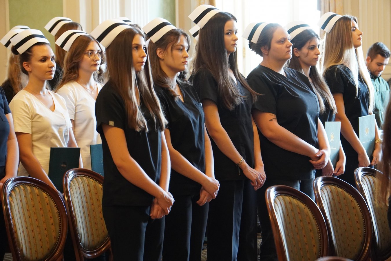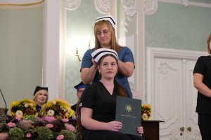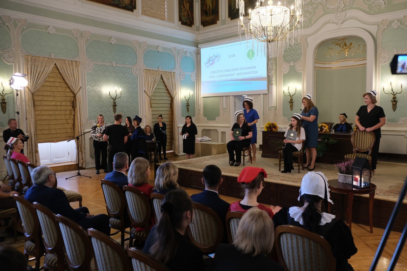 Prodziekan ds. Studenckich, prof. Ludmiła Marcinowicz, wręczała dyplomy, a opiekunowie kierunków pielęgniarstwa (dr Anna Baranowska, dr Agata Kulikowska, dr Agata Sacharewicz) i położnictwa (mgr Marta Zahor i dr Karolina Lisowska) przypinali absolwentom symboliczne czepki. Ceremonia odbywała się z dużą dbałością o tradycje akademickie – absolwenci kolejno kłaniali się w kierunku sztandaru oraz publiczności, odbierali dyplomy, a opiekunowie kierunków przypinali im symboliczne czepki.Absolwenci pielęgniarstwa i położnictwa na UMB - kwalifikacje