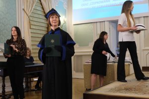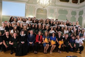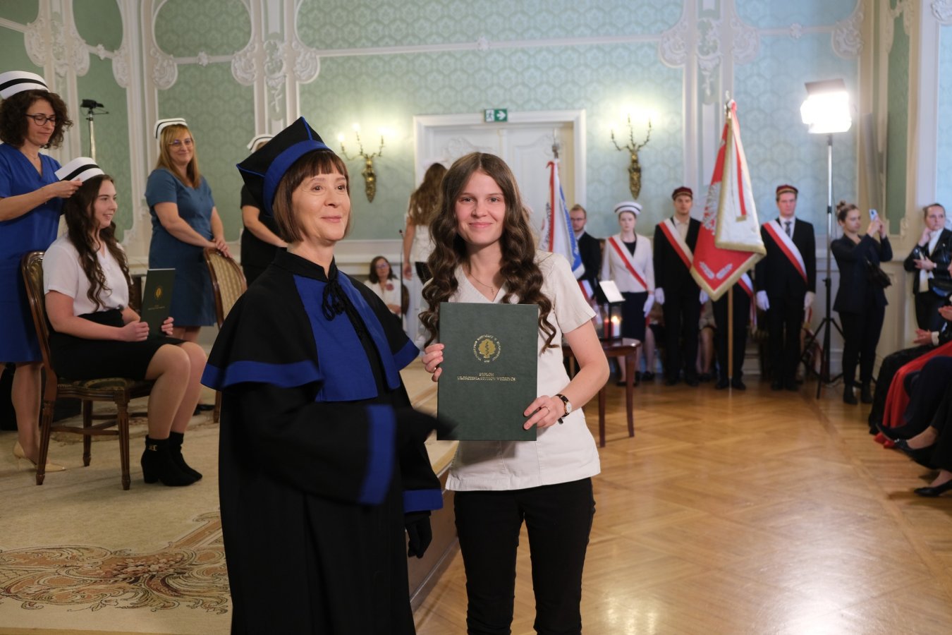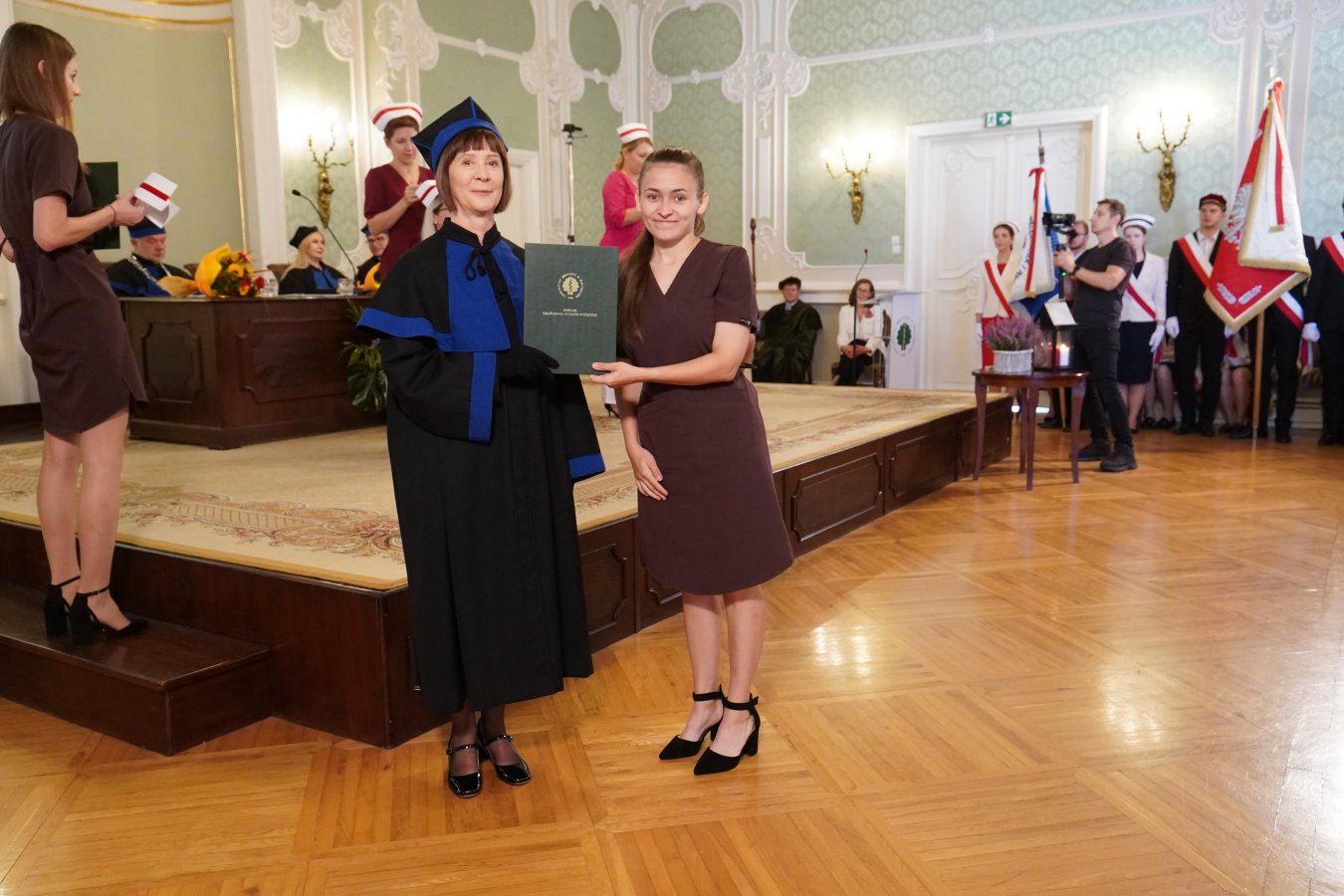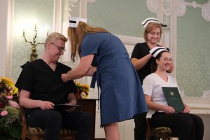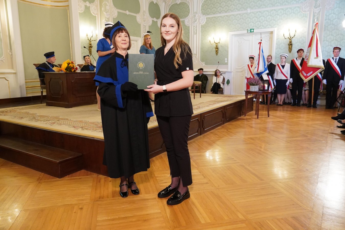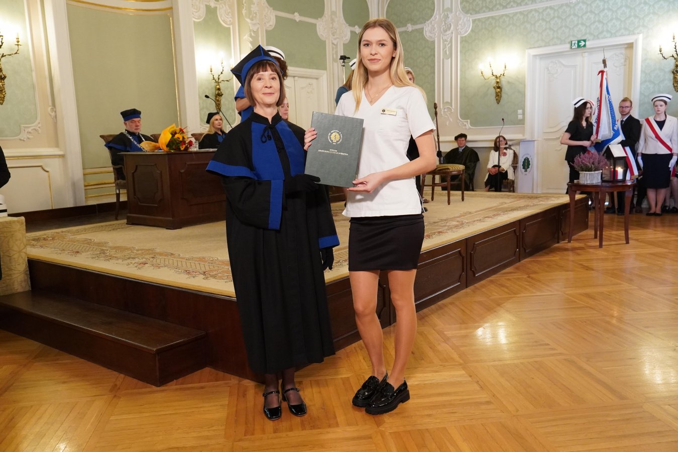 Prodziekan ds. Studenckich, prof. Ludmiła Marcinowicz, wręczała dyplomy, a opiekunowie kierunków pielęgniarstwa (dr Anna Baranowska, dr Agata Kulikowska, dr Agata Sacharewicz) i położnictwa (mgr Marta Zahor i dr Karolina Lisowska) przypinali absolwentom symboliczne czepki. Ceremonia odbywała się z dużą dbałością o tradycje akademickie – absolwenci kolejno kłaniali się w kierunku sztandaru oraz publiczności, odbierali dyplomy, a opiekunowie kierunków przypinali im symboliczne czepki.Absolwenci pielęgniarstwa i położnictwa na UMB - kwalifikacje