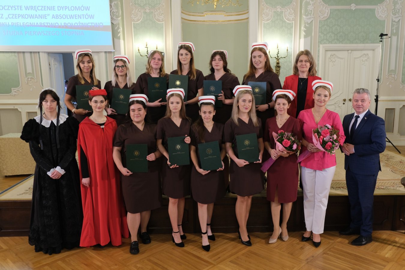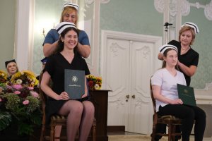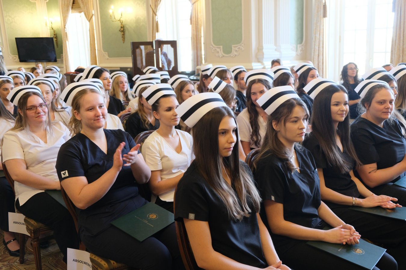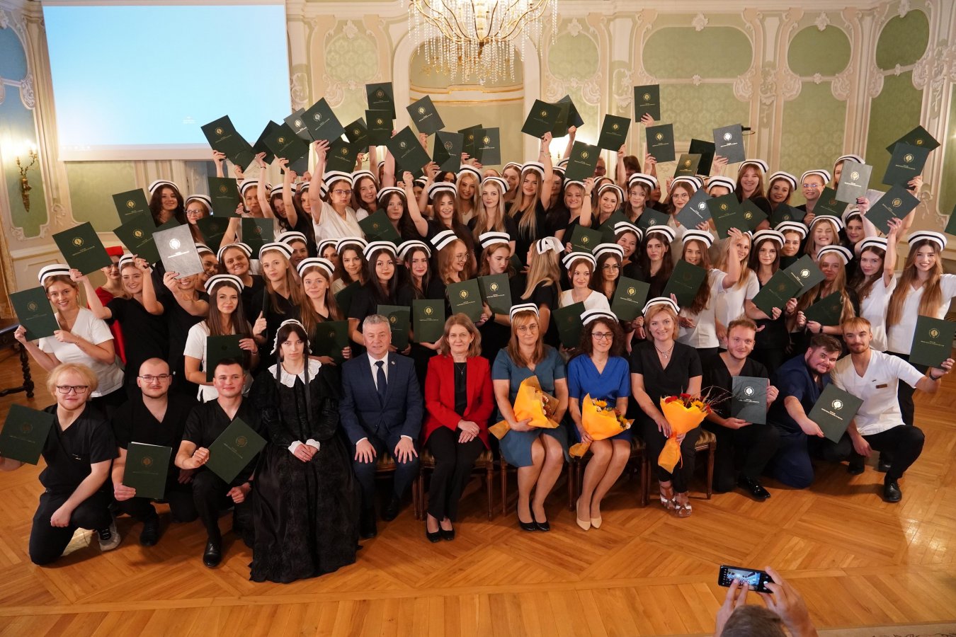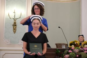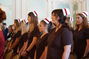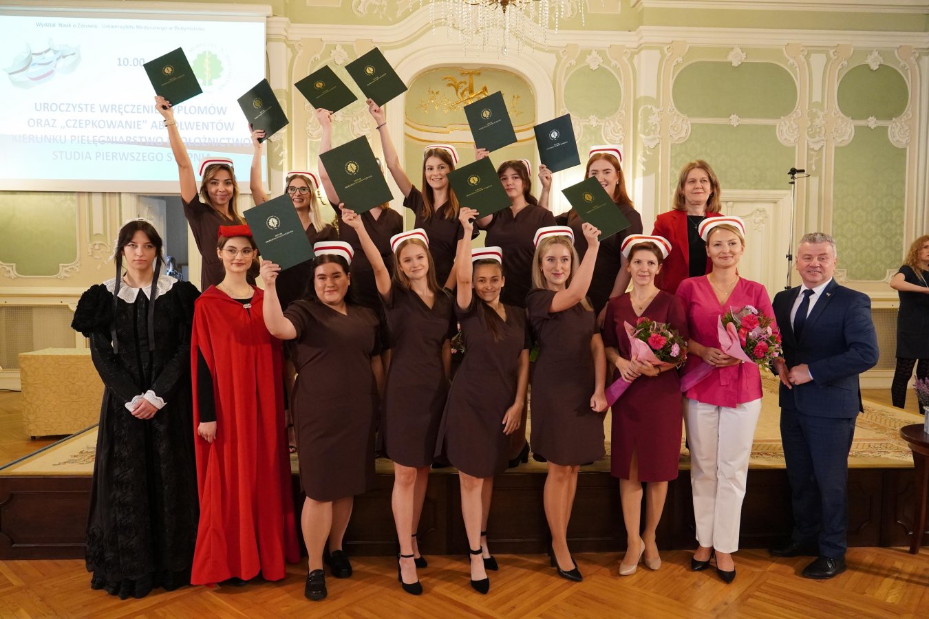 115 pielęgniarek i 15 pielęgniarzy oraz 35 położnych odebrało w tym roku dyplom ukończenia studiów pierwszego stopnia na Uniwersytecie Medycznym w Białymstoku. W poniedziałek, 21 października 2024 r., absolwenci obu kierunków - pielęgniarstwa i położnictwa - wzięli udział w ceremonii wręczenia dyplomów, a także w symbolicznym „czepkowaniu”.
