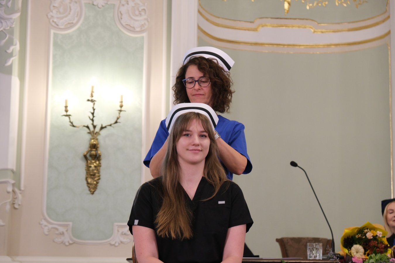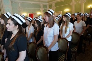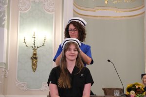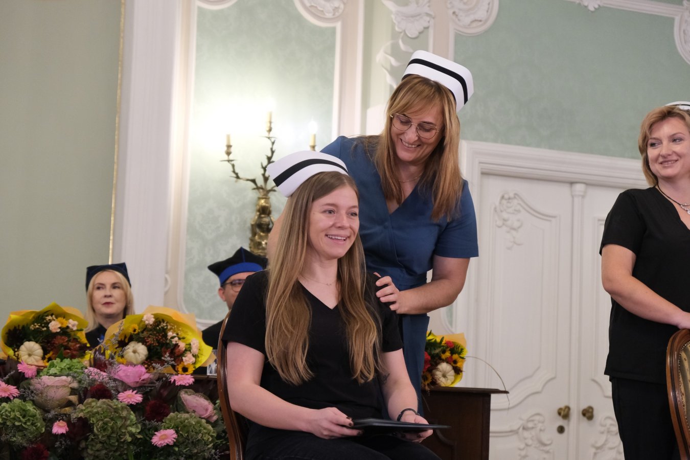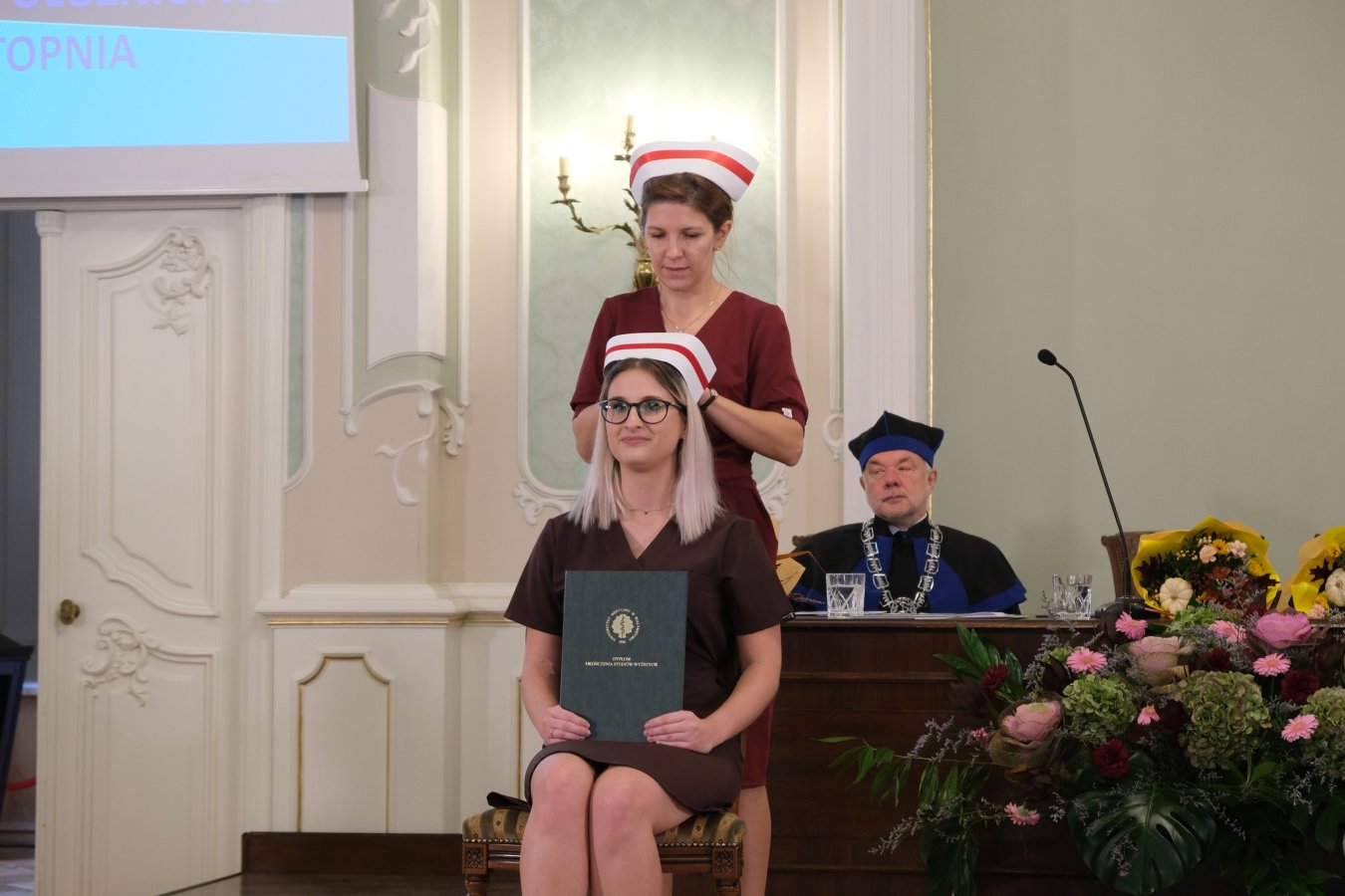 115 pielęgniarek i 15 pielęgniarzy oraz 35 położnych odebrało w tym roku dyplom ukończenia studiów pierwszego stopnia na Uniwersytecie Medycznym w Białymstoku. W poniedziałek, 21 października 2024 r., absolwenci obu kierunków - pielęgniarstwa i położnictwa - wzięli udział w ceremonii wręczenia dyplomów, a także w symbolicznym „czepkowaniu”.