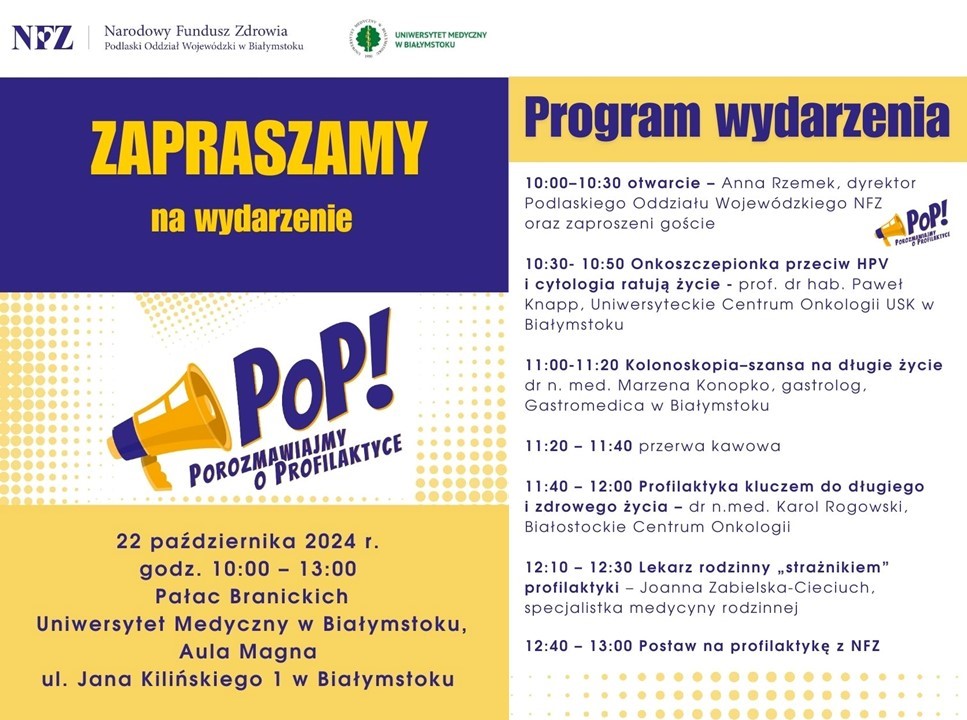 „Porozmawiajmy o Profilaktyce” – to wspólna akcja dotycząca profilaktyki prozdrowotnej przygotowana i zorganizowana przez Podlaski Oddział Narodowego Funduszu Zdrowia oraz Uniwersytet Medyczny w Białymstoku. Inauguracja akcji odbyła się we wtorek (22 października) w Auli Magna Pałacu Branickich.