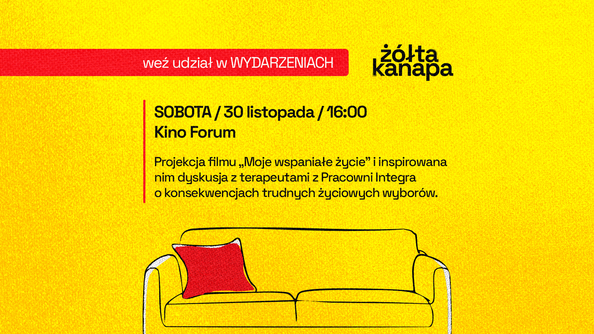 Już w najbliższą sobotę, 30 listopada, o godz. 16 zapraszamy na wyjątkowe wydarzenie organizowane w ramach kampanii społecznej „Żółta kanapa”.