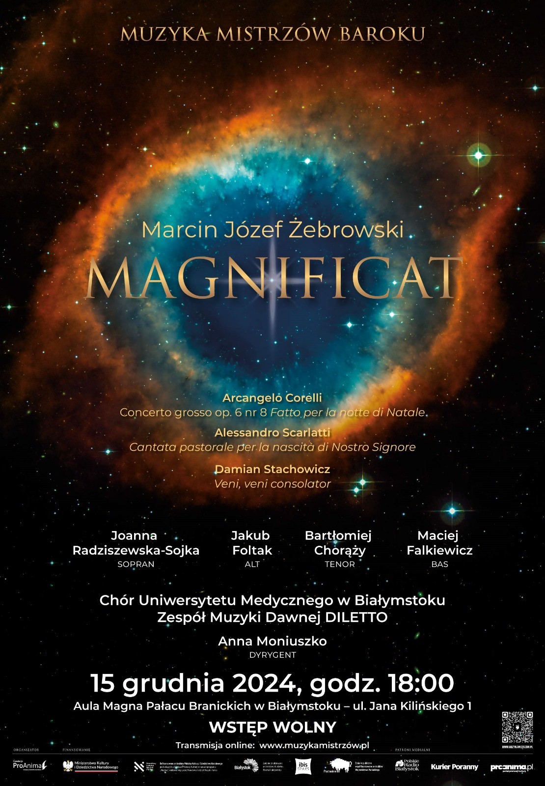 15 grudnia 2024 roku o godzinie 18:00 zapraszamy na wyjątkowy koncert bożonarodzeniowy - "Magnificat" Marcina Józefa Żebrowskiego, który odbędzie się w Aula Magna Pałacu Branickich w ramach cyklu Muzyka Mistrzów Baroku.