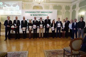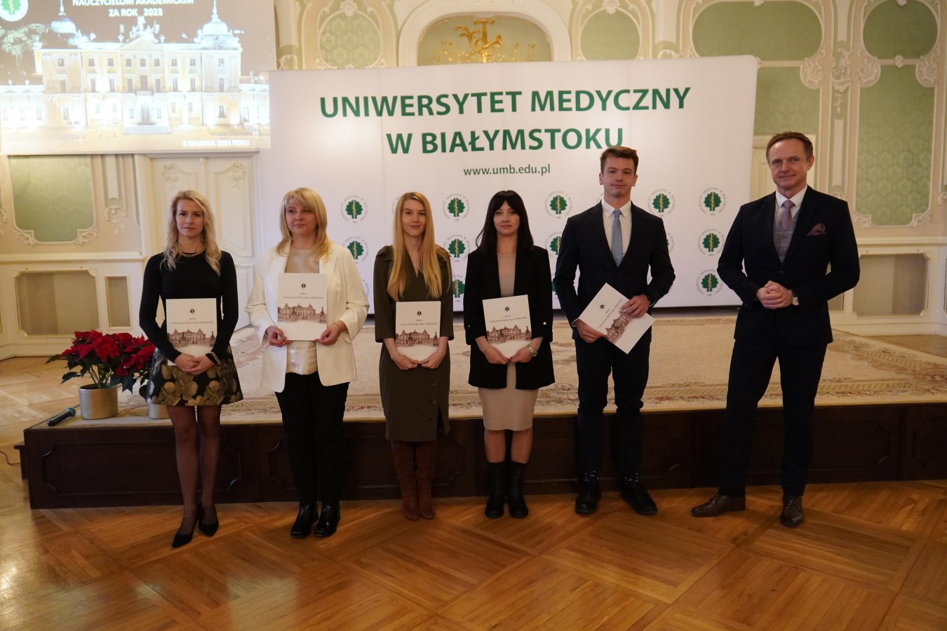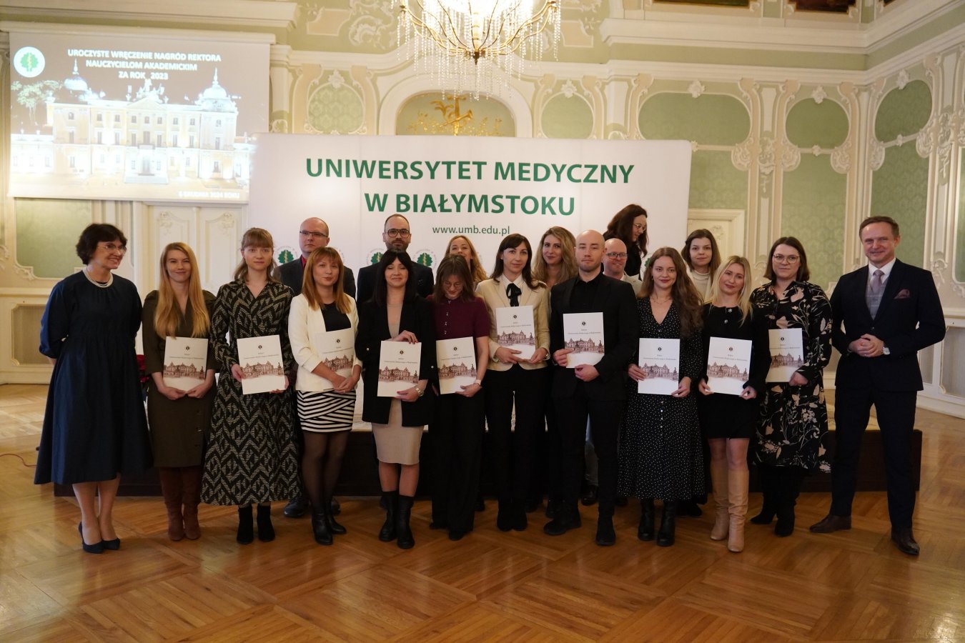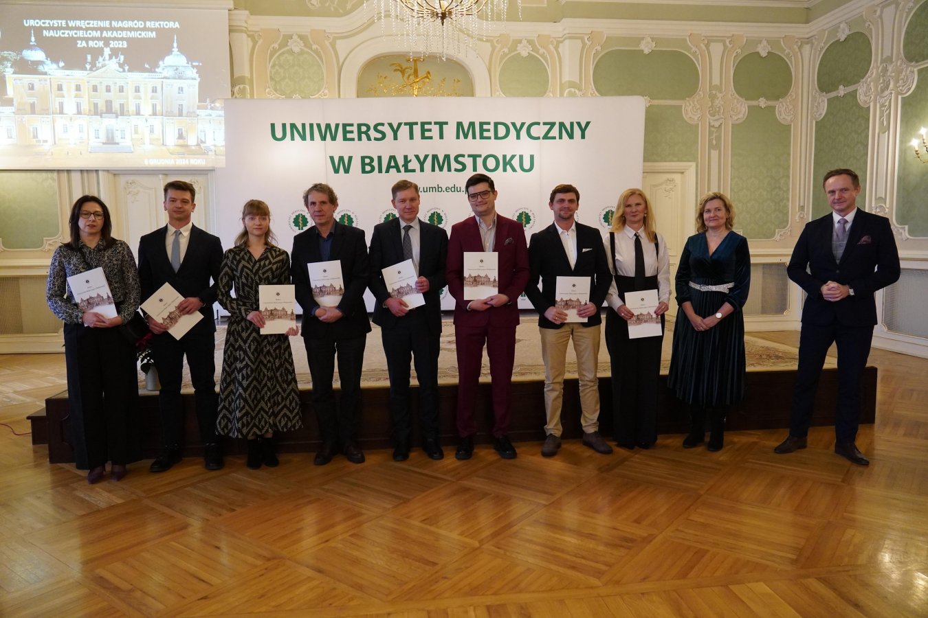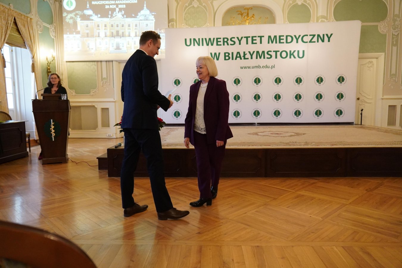 Prorektor ds. kształcenia prof. Adrian Chabowski mówił: Działalność naukowa jest niezwykle istotna i stanowi o dobrostanie Uniwersytetu Medycznego w Białymstoku. Chciałbym jednak podkreślić, że to są naczynia połączone: nauka i dydaktyka. Mamy w tej chwili największą liczbę studentów od lat. Mamy największą liczbę doktorantów wśród uczelni medycznych i to oni też dokładają swoją cegiełkę, jeżeli chodzi o potencjał publikacyjny. Zwróćcie też Państwo uwagę na to, że kształcimy w tej chwili na 16 kierunkach. My mówimy o kształceniu innowacyjnym, wysokocyfrowym. To z kolei powoduje, że mamy najlepszych kandydatów na studia z regionu. Prof. Chabowski wspólnie z Kapitułą Studencką wręczył również tytuły Najlepszego Nauczyciela Akademickiego w roku 2023 (tytuły takie otrzymało 9 osób w ramach nagród dydaktycznych).