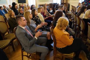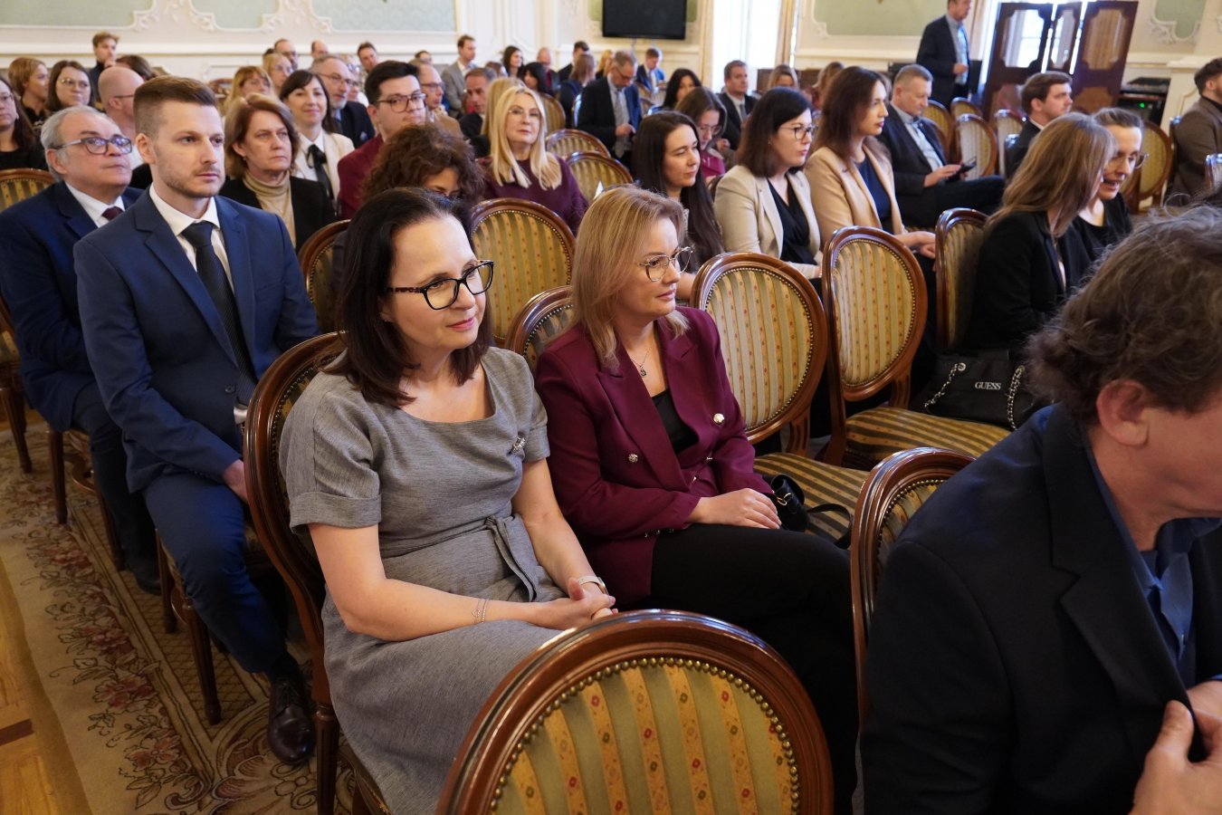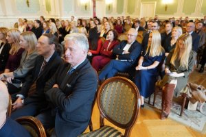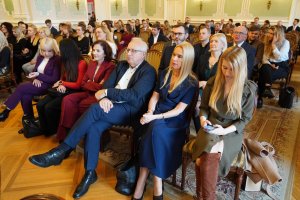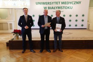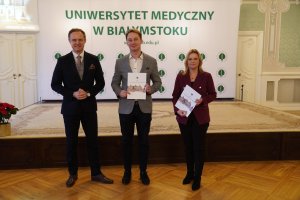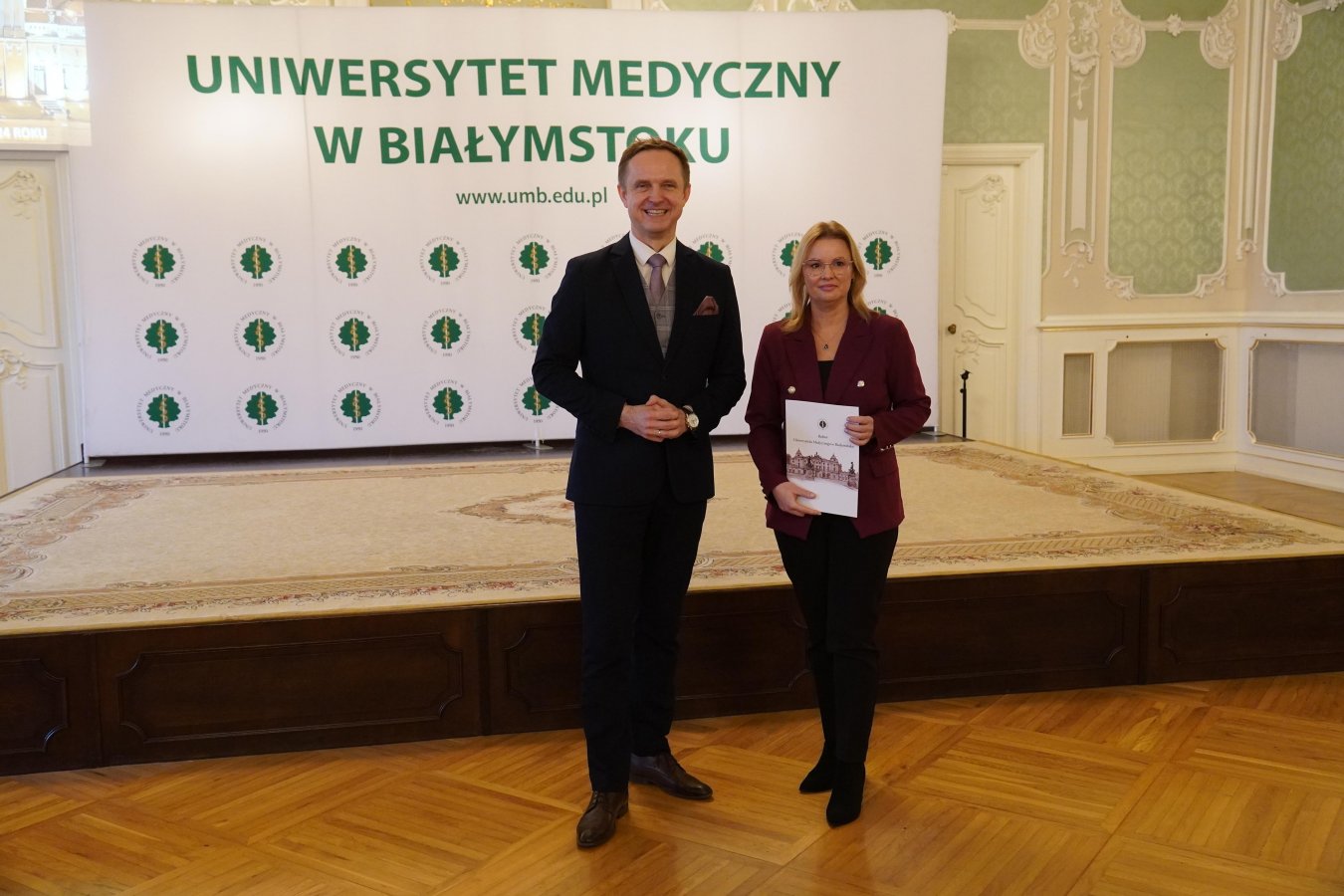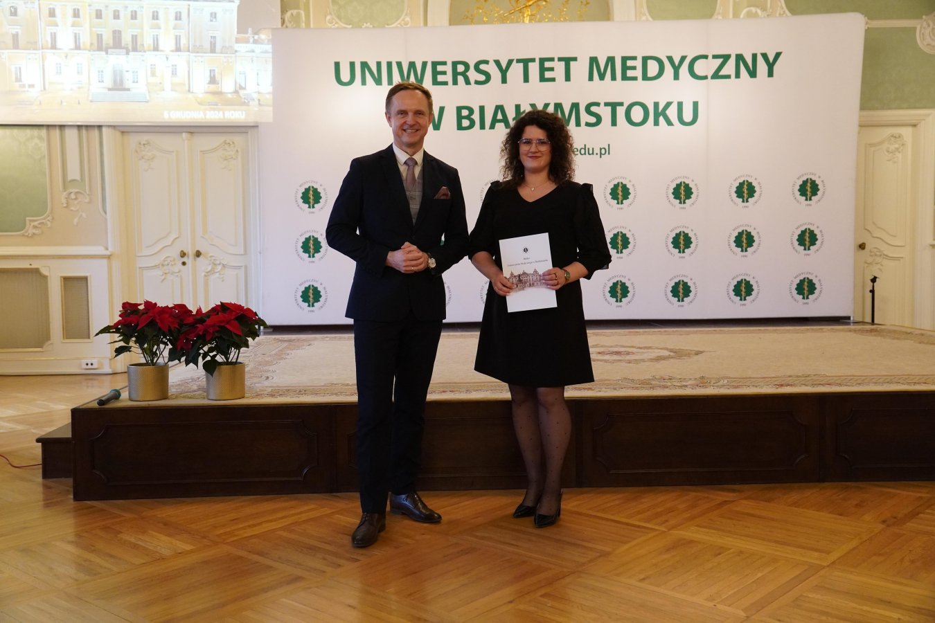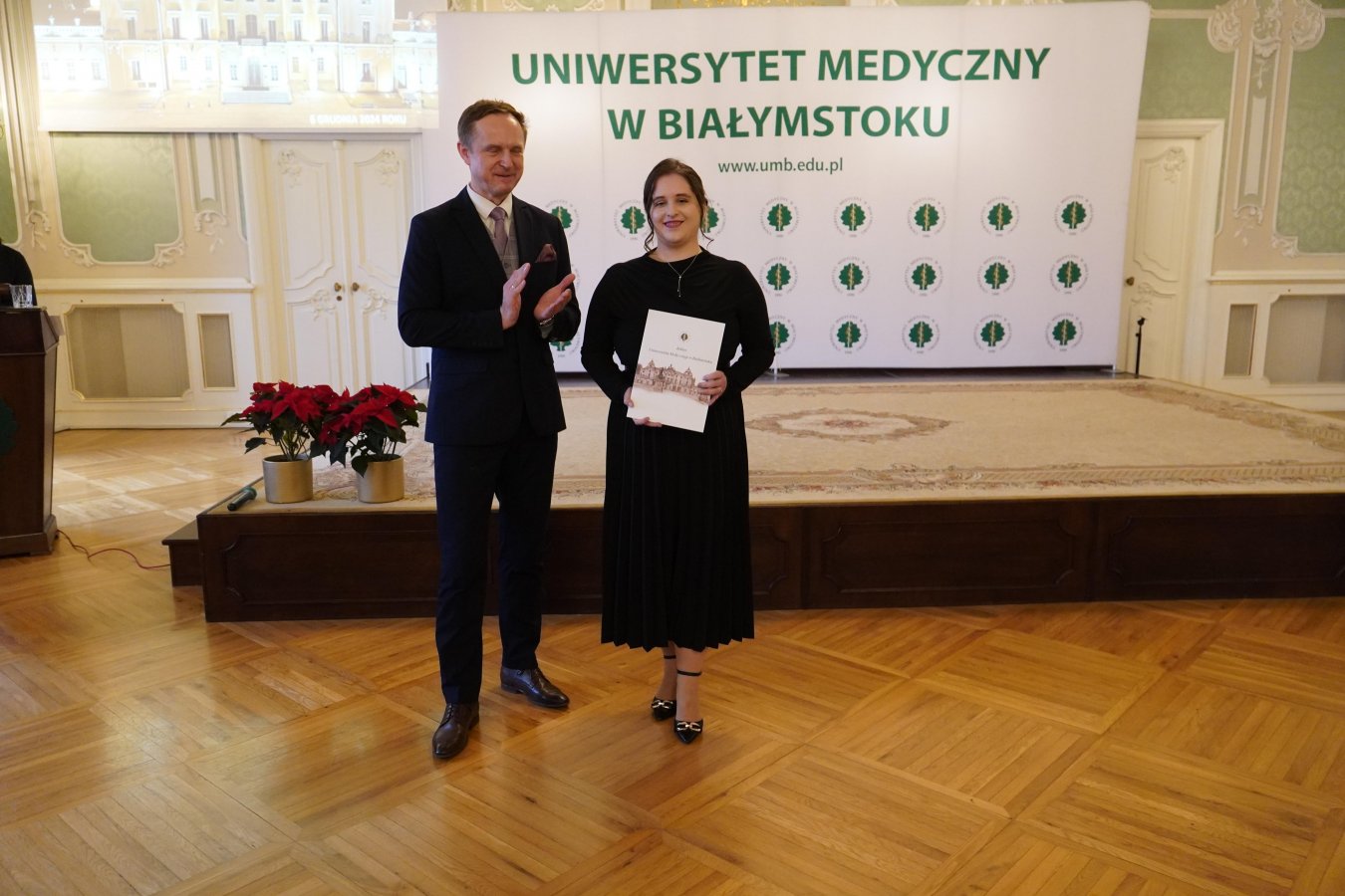 Prorektor ds. kształcenia prof. Adrian Chabowski mówił: Działalność naukowa jest niezwykle istotna i stanowi o dobrostanie Uniwersytetu Medycznego w Białymstoku. Chciałbym jednak podkreślić, że to są naczynia połączone: nauka i dydaktyka. Mamy w tej chwili największą liczbę studentów od lat. Mamy największą liczbę doktorantów wśród uczelni medycznych i to oni też dokładają swoją cegiełkę, jeżeli chodzi o potencjał publikacyjny. Zwróćcie też Państwo uwagę na to, że kształcimy w tej chwili na 16 kierunkach. My mówimy o kształceniu innowacyjnym, wysokocyfrowym. To z kolei powoduje, że mamy najlepszych kandydatów na studia z regionu. Prof. Chabowski wspólnie z Kapitułą Studencką wręczył również tytuły Najlepszego Nauczyciela Akademickiego w roku 2023 (tytuły takie otrzymało 9 osób w ramach nagród dydaktycznych).