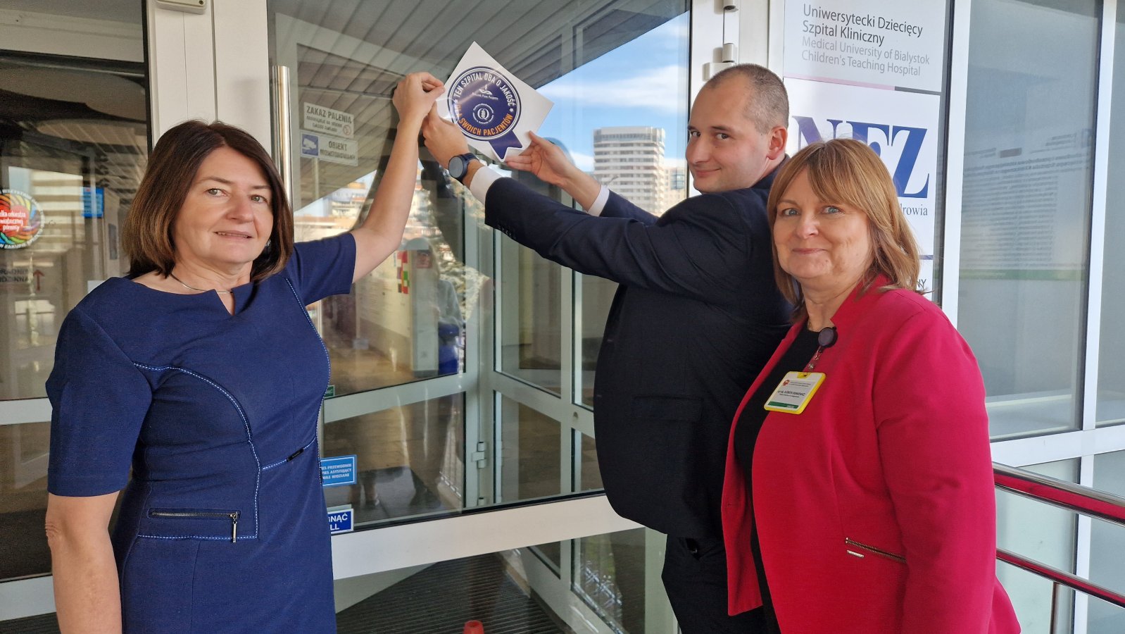 Certyfikat oraz specjalne naklejki, które wkrótce zostaną umieszczone w kilku punktach szpitala, wręczył dziś Dyrekcji i przedstawicielom UDSK Dyrektor Departamentu Współpracy w Biurze Rzecznika Praw Pacjenta Jakub Adamski. W uroczystości udział wzięli prof. Anna Wasilewska - Dyrektor UDSK w Białymstoku, prof. Janusz Dzięcioł - Prorektor ds. Klinicznych i Szkolenia Zawodowego UMB, Elżbieta Sienkiewicz - Zastępca Dyrektora szpitala ds. Pielęgniarstwa, Cezary Rzemek - Zastępca Dyrektora ds. Ekonomicznych, Wojciech Roszkowski - Zastępca Dyrektora ds. Administracyjno-Technicznych, Anna Hanus-Surmasiewicz z Działu Organizacji i Jakości i Anna Sosnowska - Pełnomocnik Dyrektora ds. Praw Pacjenta.