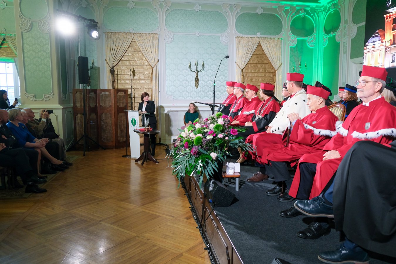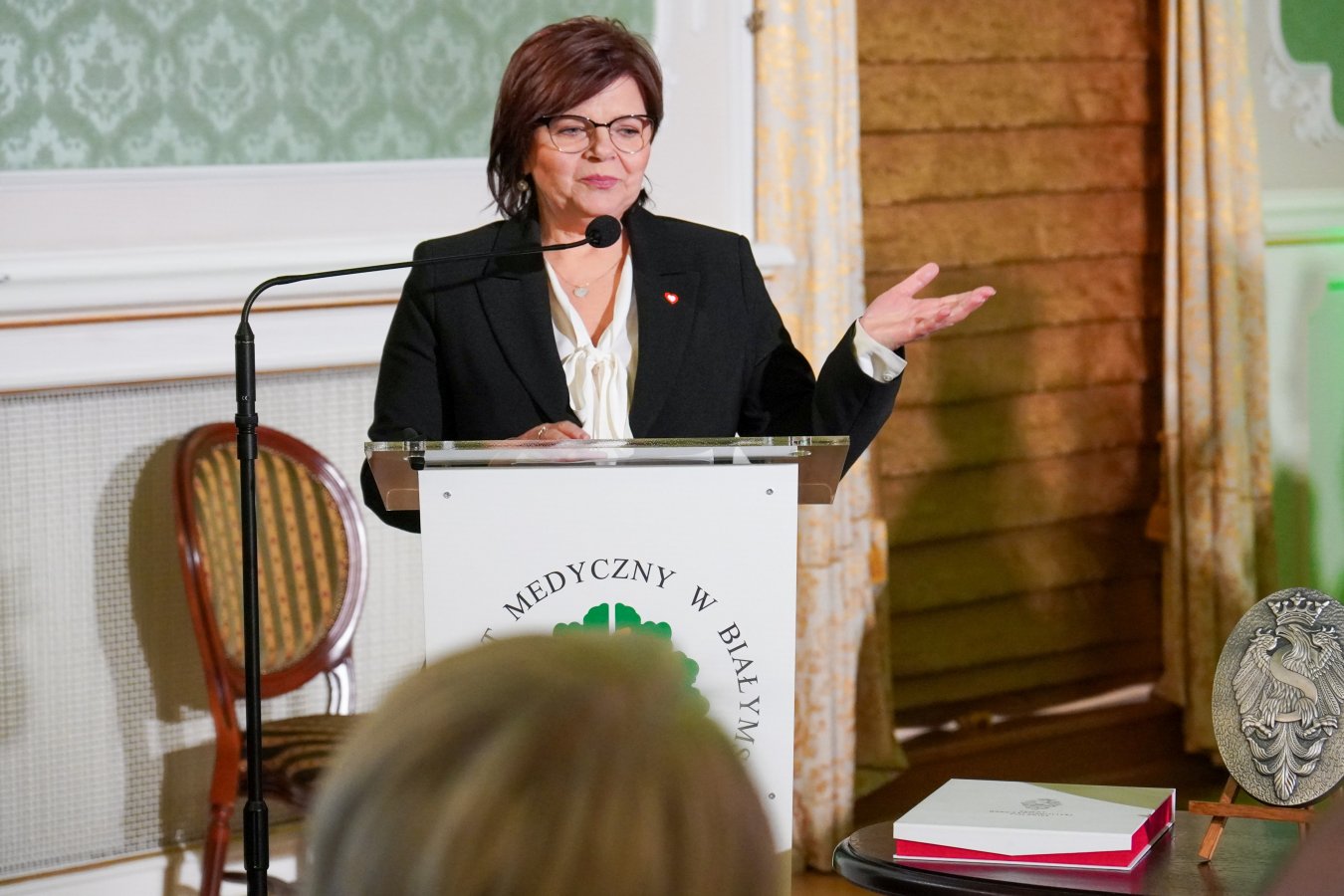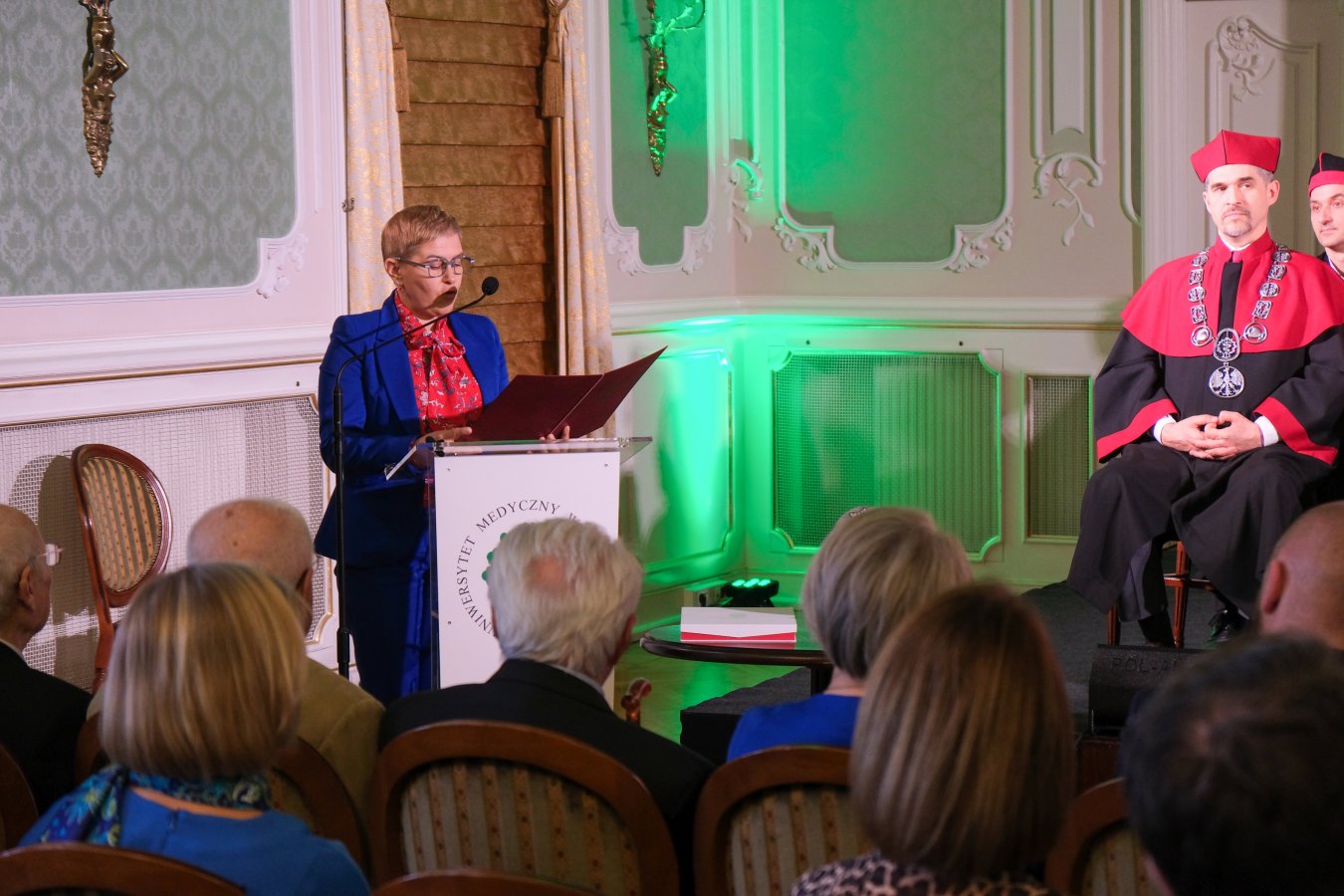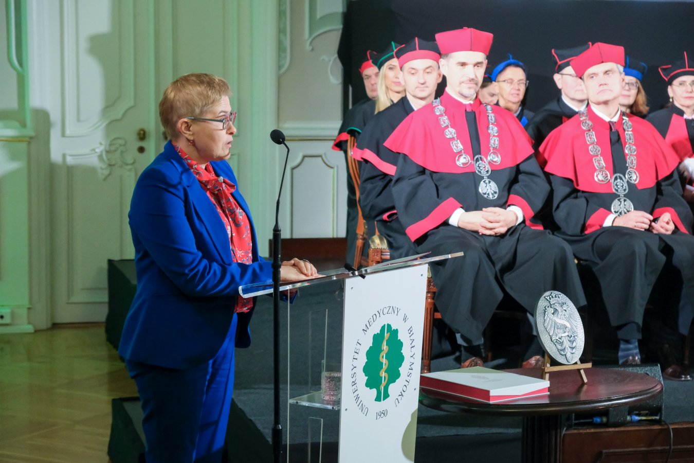 Maria Mrówczyńska przeczytała list od Ministra Nauki i Szkolnictwa Wyższego, przygotowany z okazji jubileuszu uczelni. W liście minister Marcin Kulasek serdecznie gratulował uczelni rocznicy oraz skierował słowa uznania w kierunku całej społeczności akademickiej UMB. Podkreślił unikatowość prowadzonych na uczelni badań oraz jej wkład w rozwój polskiej medycyny.