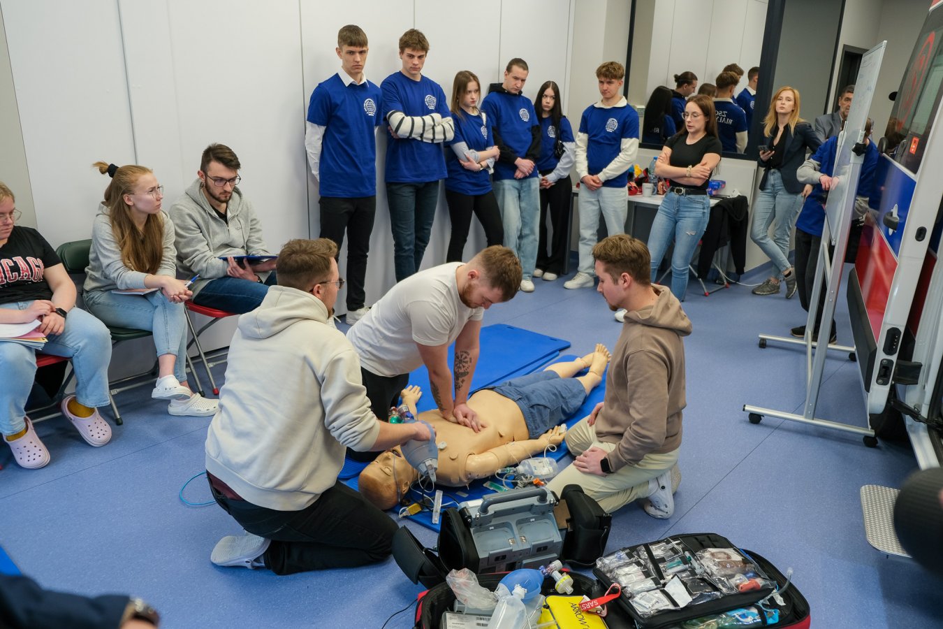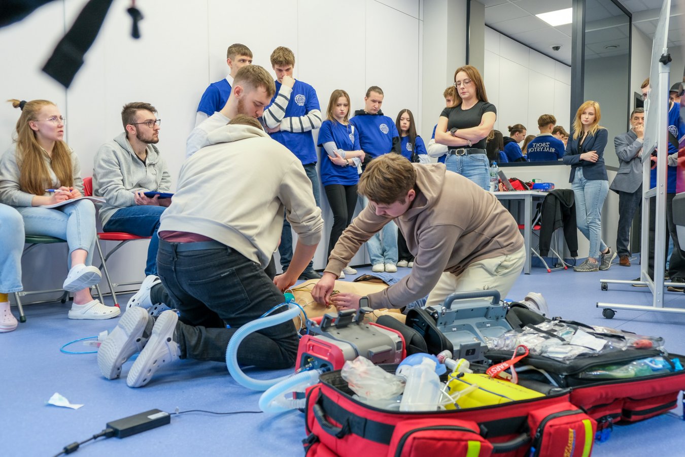 Tuż po podpisaniu umowy, uczniowie obecni na spotkaniu uczestniczyli w zajęciach studentów III roku ratownictwa medycznego, które odbywały się w Centrum Symulacji Medycznych. Młodzi ludzie przyglądali się akcji reanimacyjnej i czynnościom, które musieli wykonać szkolący się ratownicy. Ich zadanie polegało na pomocy osobie, która upadła na spacerze w parku i straciła przytomność. Musieli ustalić co się jej stało, w międzyczasie wykonać resuscytację, przygotować pacjenta do transportu i przekazać informację o wykonanych czynnościach ekipie ze Szpitalnego Oddziału Ratunkowego. Całość akcji trwała ledwie kilka minut, a zrobiła na uczniach ogromne wrażenie.