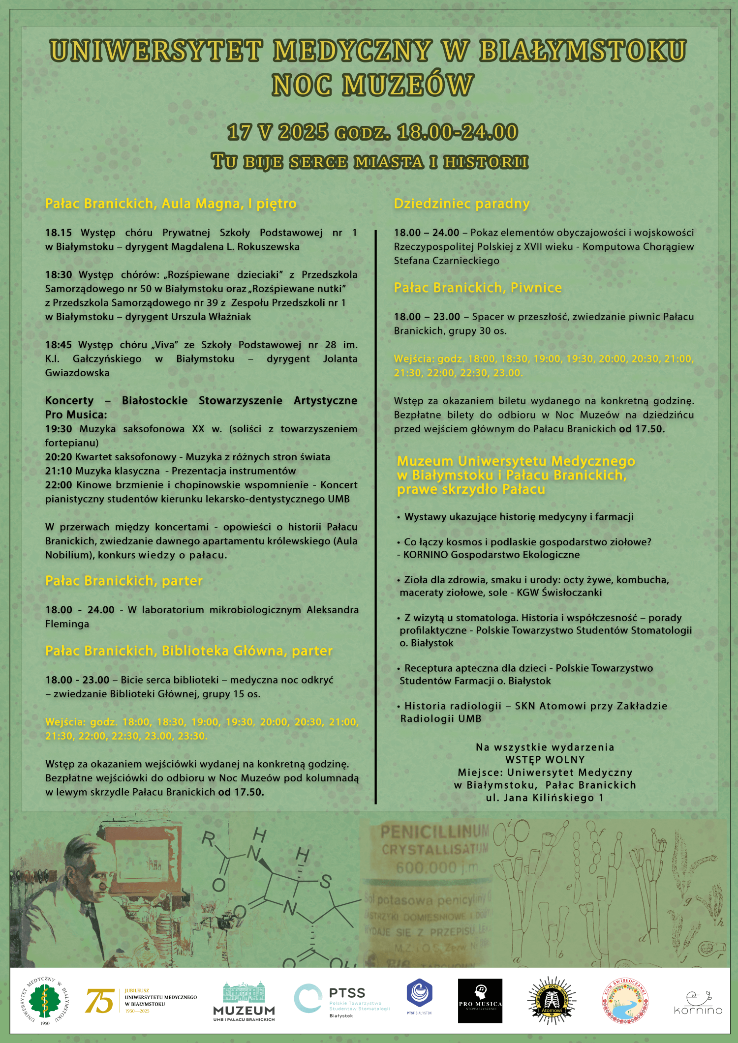 Wstęp za okazaniem biletu wydanego na konkretną godzinę. Bezpłatne bilety do odbioru na dziedzińcu przed wejściem głównym do Pałacu Branickich od 17.50.