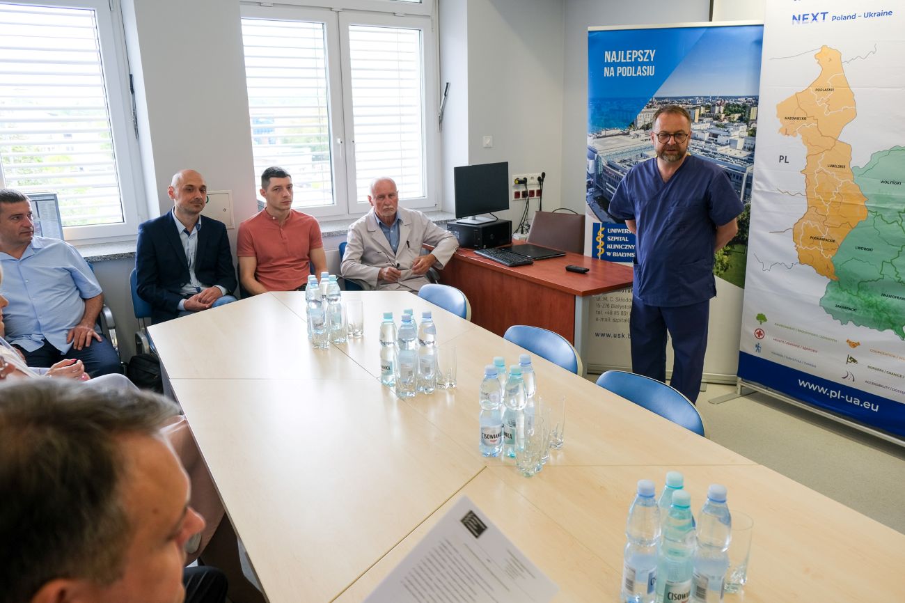 Dziesięcioosobowa delegacja z Wołyńskiego Obwodowego Szpitala Klinicznego w Łucku odwiedziła w piątek (27 czerwca 2025r.) Klinikę Neurochirurgii Uniwersyteckiego Szpitala Klinicznego w Białymstoku. Lekarze i pielęgniarki z Ukrainy mogli przyjrzeć się pracy Kliniki, a także jako obserwatorzy uczestniczyć w dwóch operacjach neurochirurgicznych.