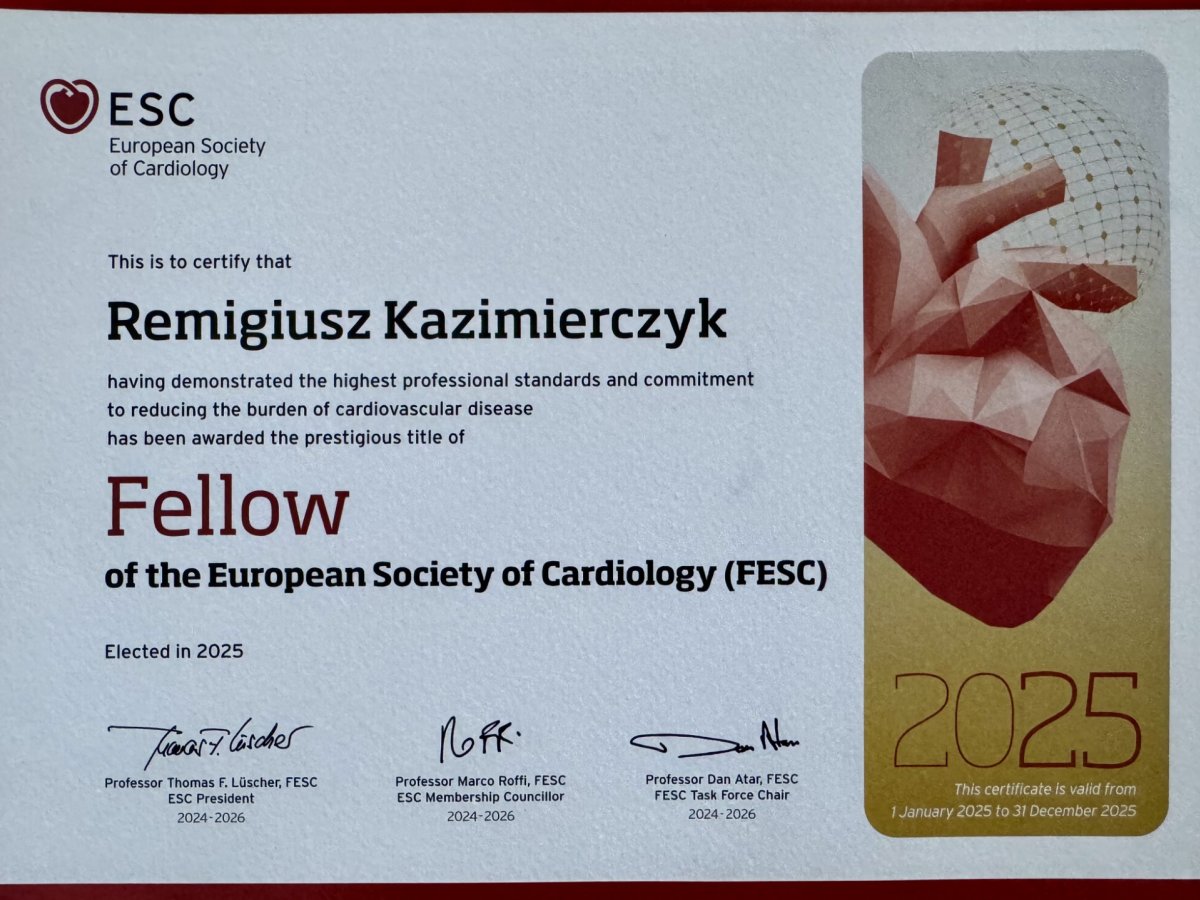 Prestiżowy tytuł Fellow of the European Society of Cardiology (FESC) otrzymał dr hab. Remigiusz Kazimierczyk z Kliniki Kardiologii i Chorób Wewnętrznych Uniwersytetu Medycznego w Białymstoku.