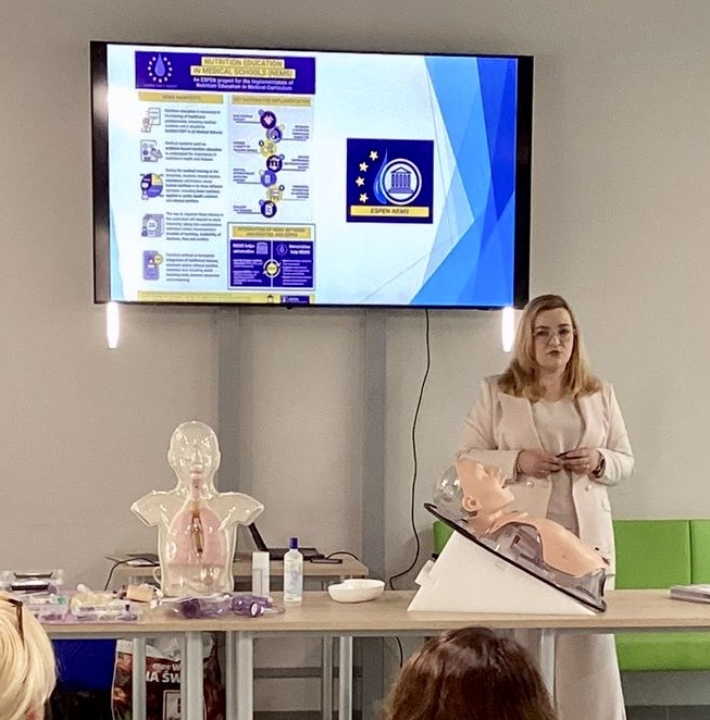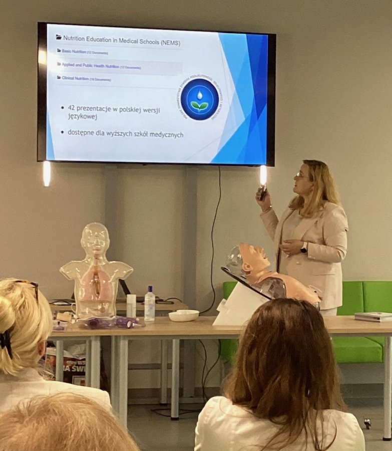 Wiedza i inspiracje z międzynarodowego forum znalazły również swoje zastosowanie 24 września 2025 r na UMB. Dr Bogdanowska-Charkiewicz poprowadziła szkolenie dla nauczycieli akademickich pod hasłem „Edukacja w zakresie leczenia żywieniowego. Żywienie dojelitowe dzieci i dorosłych”. Uczestniczyli w nim wykładowcy kształcący przyszłych lekarzy, pielęgniarki, dietetyków i farmaceutów. Podczas zajęć warsztatowych omówiono m.in. możliwości współpracy z towarzystwami naukowymi POLSPEN i ESPEN, korzystania z materiałów NEMS oraz wsparcia udzielanego przez Fundację Nutricia, z którą UMB współpracuje od dwóch lat.