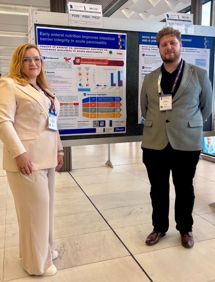 W sesji plakatowej zaprezentowano również pracę „Early enteral nutrition improves intestinal barrier integrity in acute pancreatitis”, autorstwa Mateusza Malinowskiego, Aleksandry Lewczak i dr Bogdanowskiej-Charkiewicz, przygotowaną przez Studenckie Koło Żywienia Klinicznego UMB.