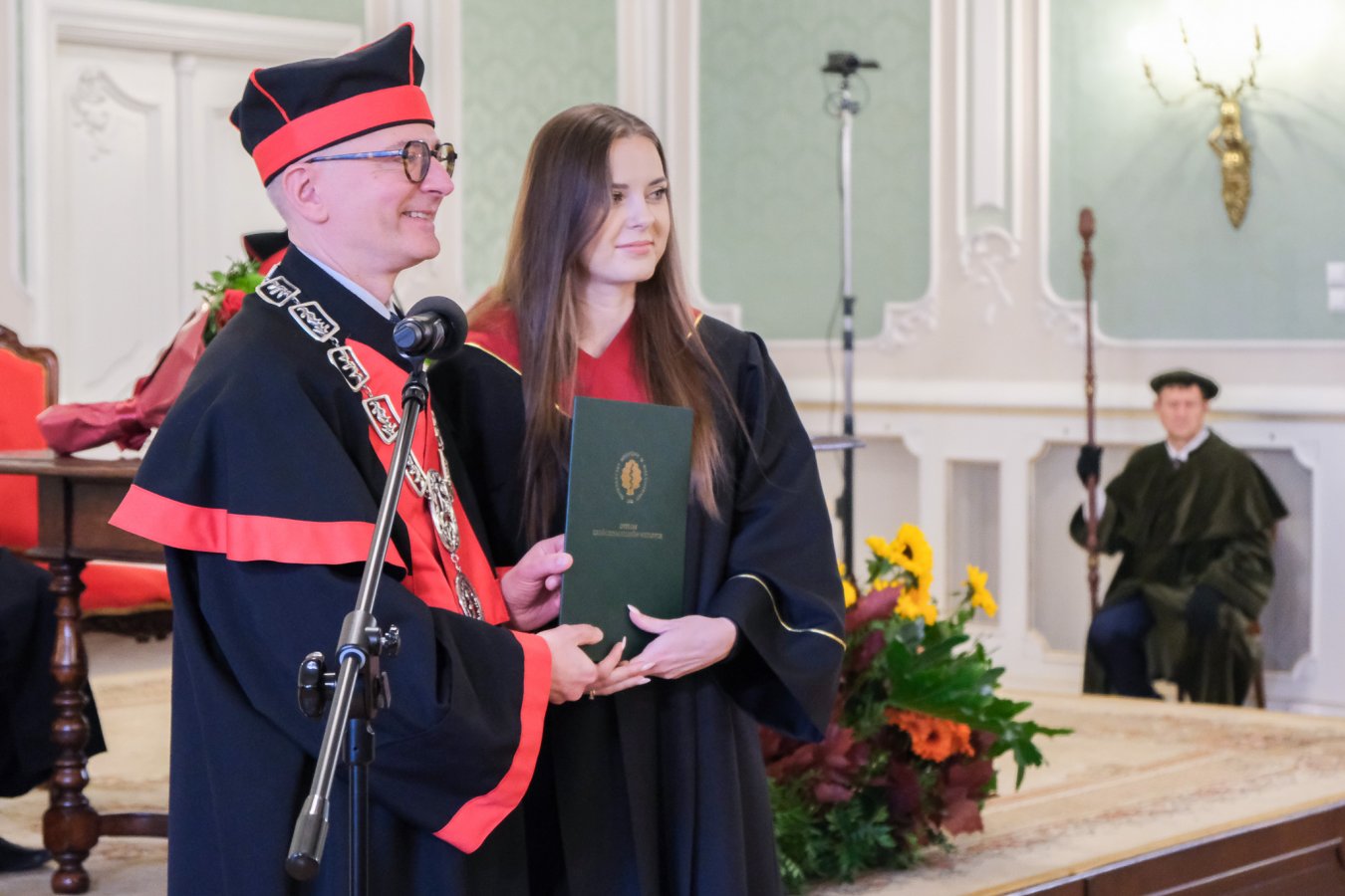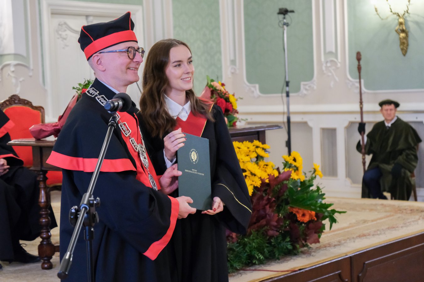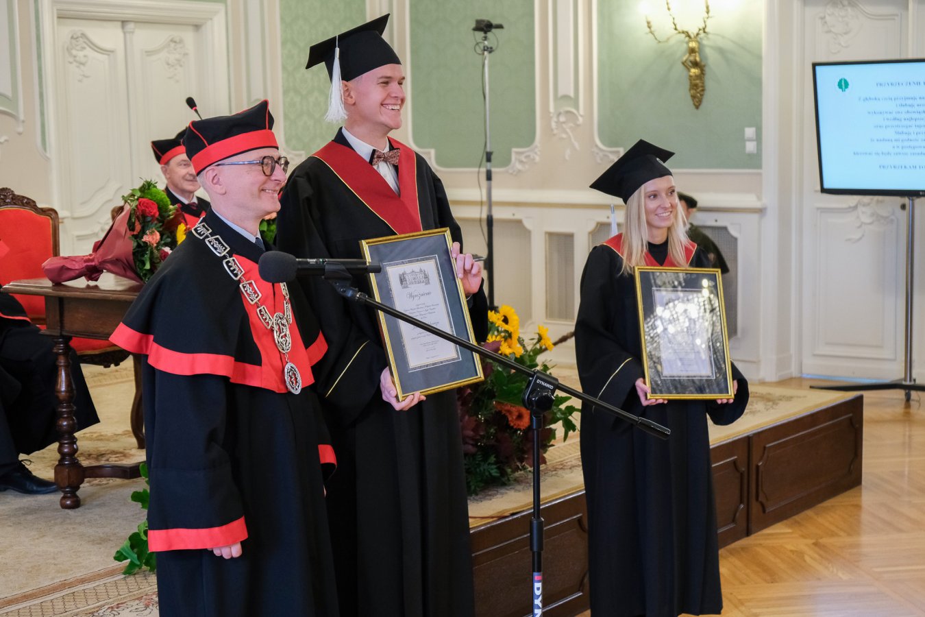 Dziekan prof. Tomasz Hryszko wyróżnił studentów, którzy swoją postawą, inicjatywą i współpracą realnie wspierali życie Uczelni i społeczności akademickiej. Dyplomy z rąk prof. Hryszki odebrali: Aleksandra Magnuszewska i Jakub Piotr Zadykowicz.