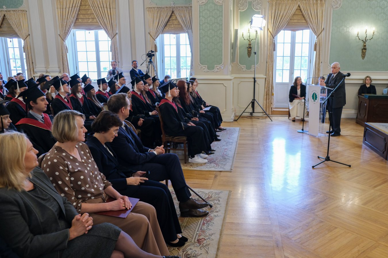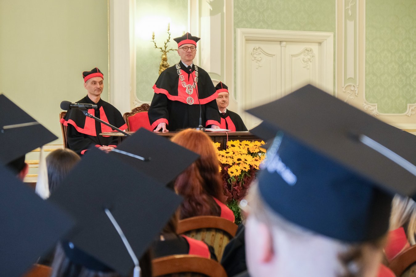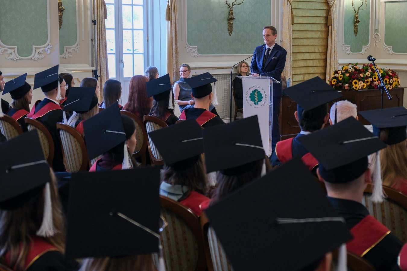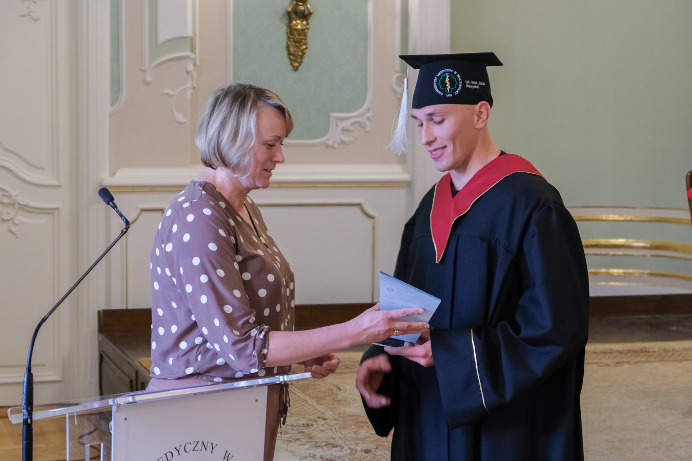 Dziekan Tomasz Hryszko podziękował wszystkim absolwentom za wspólne lata i współpracę. Przypomniał doskonałe wyniki egzaminu LDEK, w którym co roku nasi studenci zajmują miejsca na podium. To ogrom pracy i wielkie osiągniecie, które komplementował ze sceny prof. Hryszko.