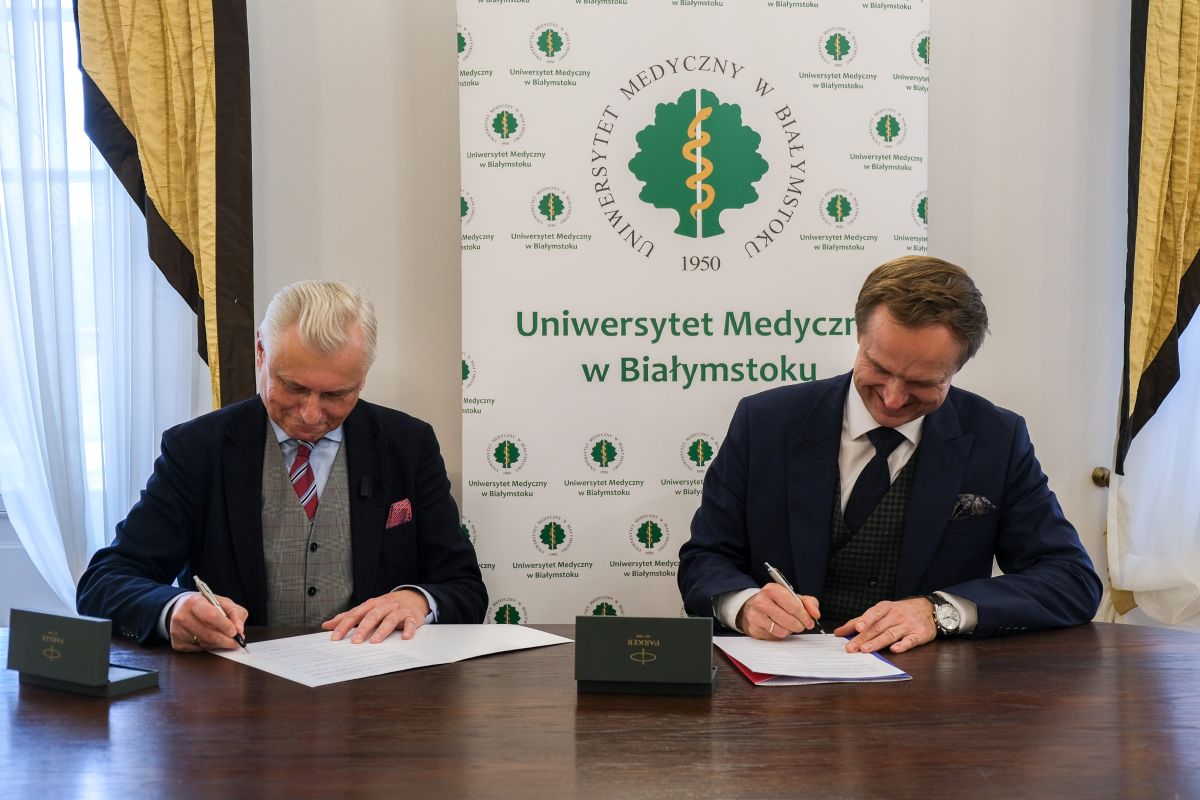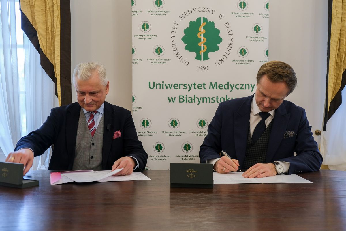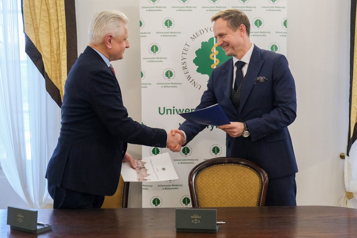 Stosowne dokumenty parafowano w piątek (17 listopada 2025r.) w Rektoracie Uczelni. UMB reprezentował Rektor prof. Marcin Moniuszko, Fundację – jej założyciel Jan Zygmunt Trusewicz, który jest absolwentem naszej Uczelni z 1985 roku.