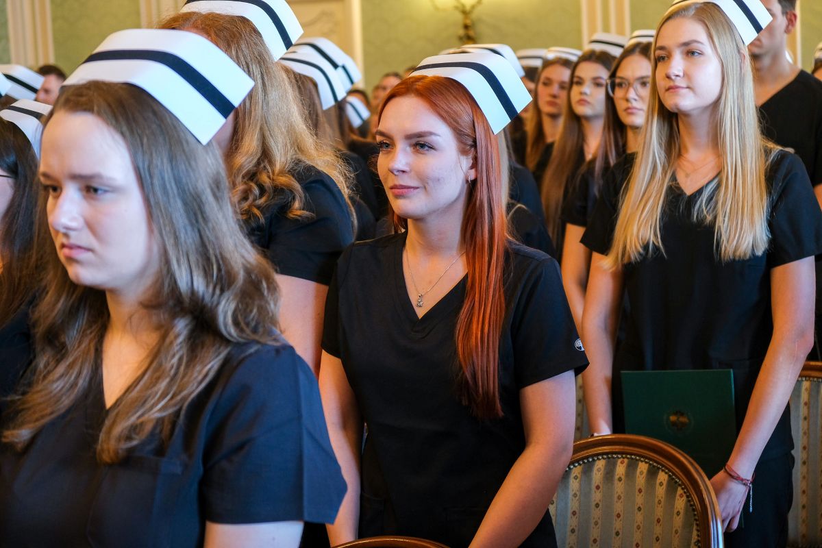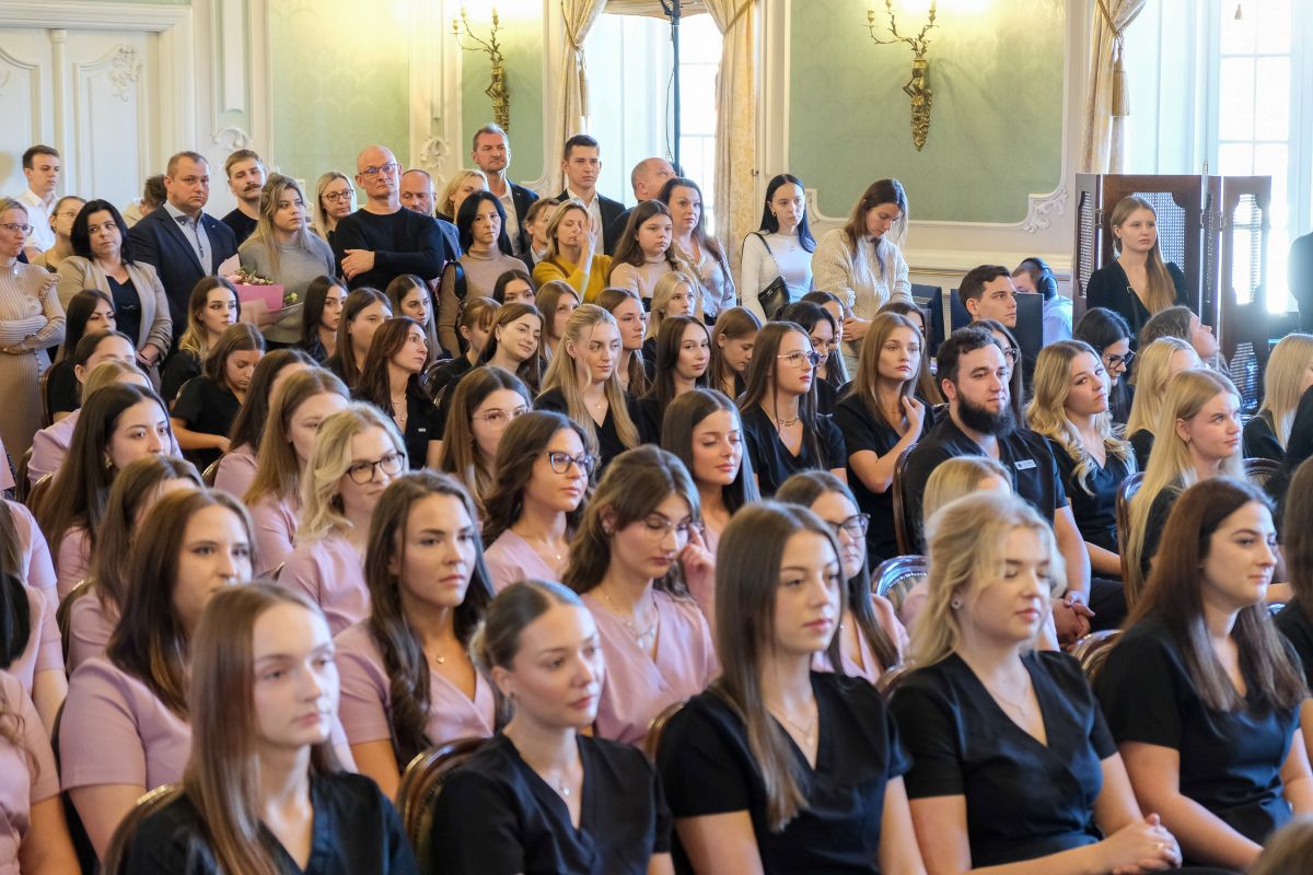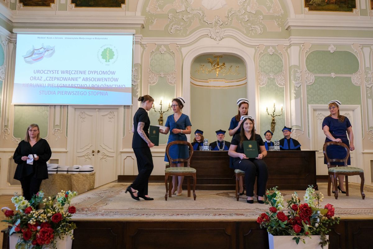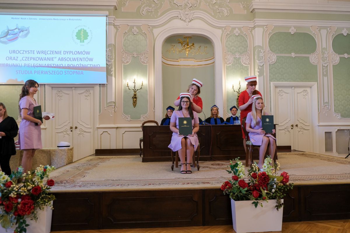 We wtorkowe południe (21 października 2025r.), w Aula Magna Pałacu Branickich, odbyło się uroczyste dyplomatorium studentów I stopnia studiów na kierunku pielęgniarstwo i położnictwo, połączone z czepkowaniem. 128 nowych pielęgniarek i pielęgniarzy oraz 31 położnych odebrało swoje dokumenty poświadczające nabyte kwalifikacje.
