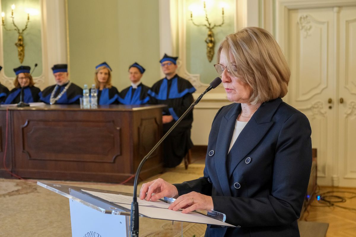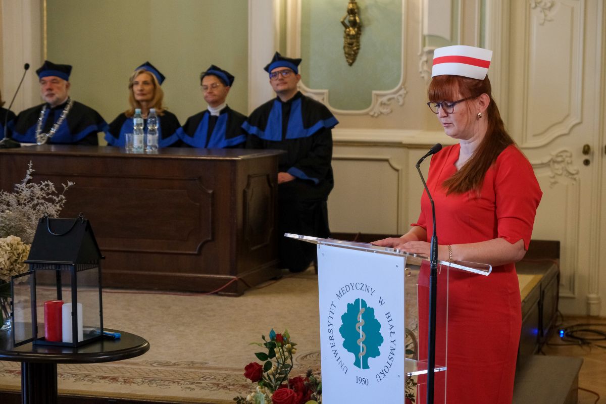 Rektor UMB prof. Marcin Moniuszko: Chcę Wam serdecznie pogratulować, bo wybraliście nie tylko jedną z piękniejszych przygód w medycynie, ale w ogóle jedną z piękniejszych przygód w całym życiu. Naprawdę trudno to z czymkolwiek porównać. Tak, to będzie ciężka praca, ale niesłychanie zaszczytna. Będziecie Państwo dotykać istoty ludzkiego człowieczeństwa, które objawia się właśnie w tych chwilach najbardziej kryzysowych. Właśnie wtedy, kiedy dotyka nas najgłębsze cierpienie. To jest trudne, to jest wymagające, ale to jest też olbrzymi zaszczyt. Niewiele innych zawodów, które możecie sobie wyobrazić, może dostąpić takiego zaszczytu.