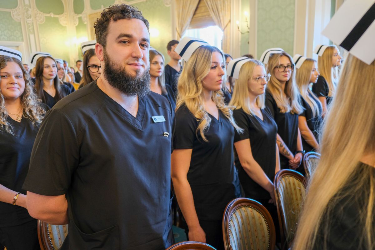 Dzisiejsza uroczystość ma szczególny wymiar. To moment, w którym wkraczacie w świat zawodów o niezwykłej misji, zaufaniu społecznym i głębokim powołaniu do służby drugiemu człowiekowi. Czepkowanie to nie tylko tradycja, to akt przyjęcia odpowiedzialności, wyraz gotowości do niesienia pomocy, empatii i profesjonalizmu – powiedział do zebranych prof. Sławomir Terlikowski, Dziekan Wydziału Nauk o Zdrowiu UMB.