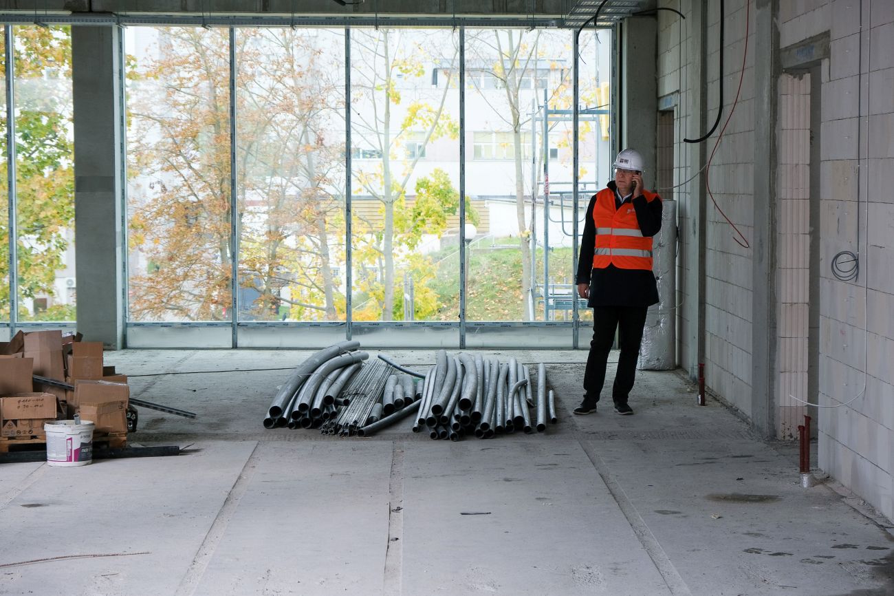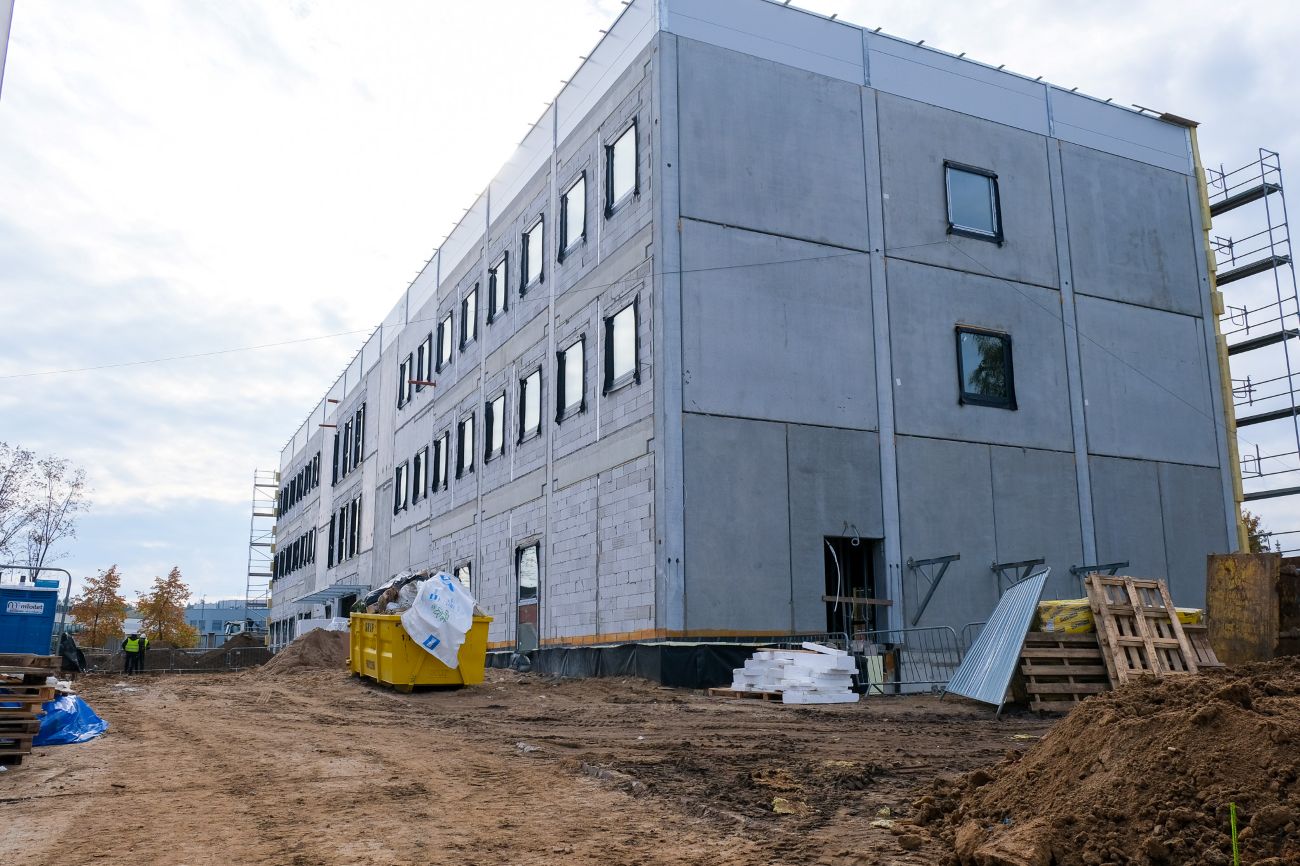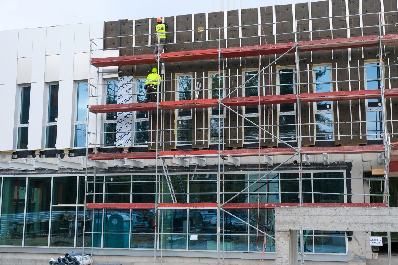 Paweł Żeruń, kierownik budowy: Zaawansowanie prac oceniam na około 70 procent. Jest postawiona główna konstrukcja parafabrykowana, stelaże wszystkich ścianek działowych. Trwają prace związane z wykonaniem centralnego ogrzewania poszczególnych kondygnacji oraz szlicht posadzkowych. Jesteśmy na ukończeniu prac związanych z wykonywaniem instalacji kanalizacji deszczowej. Przed nami jeszcze gros prac wykończeniowych, ale one będą się już odbywać wewnątrz budynku, więc zima nam nie będzie przeszkadzać.