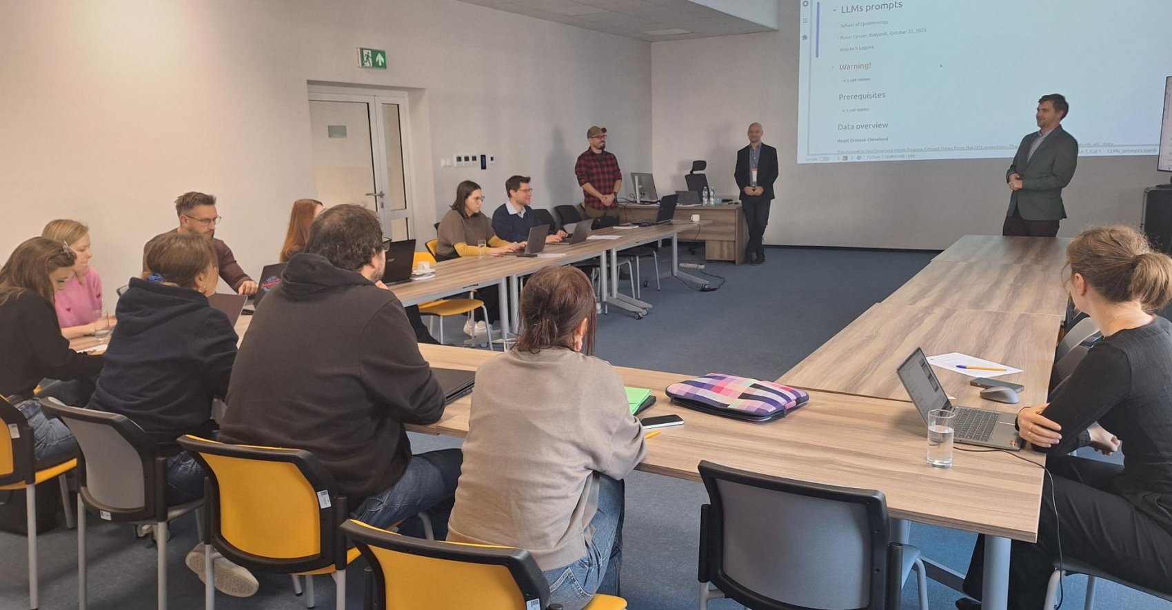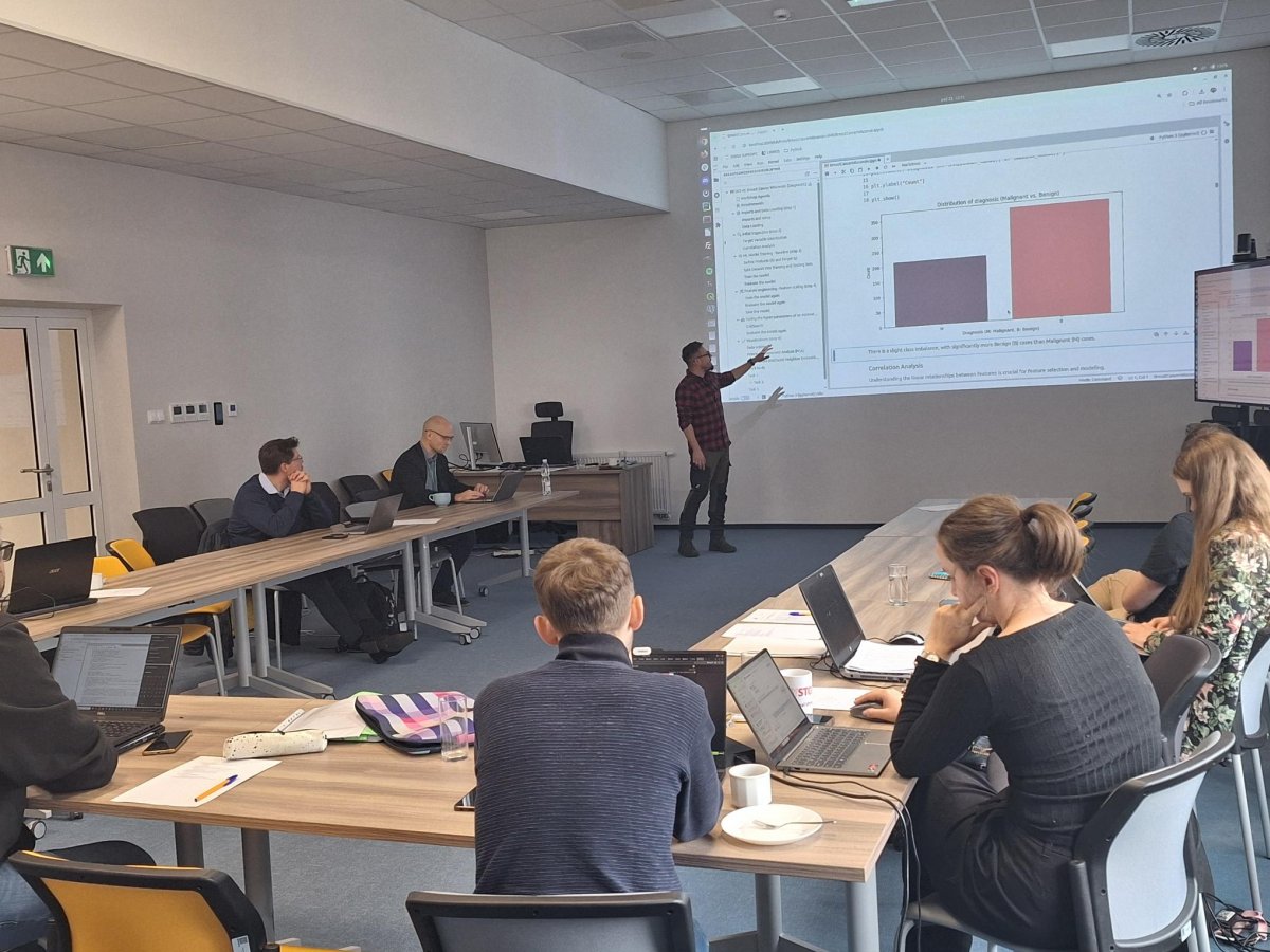 Ostatniego dnia, 22 października, uczestnicy zagłębiali się w wykorzystanie sztucznej inteligencji i proteogenomiki w badaniach zdrowotnych. Mgr inż. Wojciech Łaguna – ekspert UMB w analizie danych medycznych i komercjalizacji projektów IT – pokazał, jak łączyć statystykę, machine learning i wiedzę kliniczną w badaniach populacyjnych w ramach projektu Białystok PLUS. Mgr inż. Piotr Tynecki, ekspert UMB w zakresie AI, oraz dr Marios Dimitriou przedstawił praktyczne przykłady wykorzystania danych Olink w badaniach proteogenomicznych.