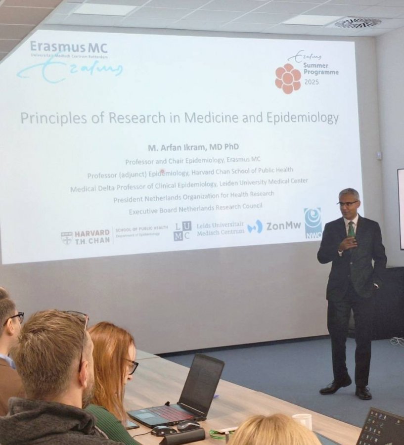 Szczególnym akcentem była wizyta ekspertów z Erasmus MC w Rotterdamie. Prof. dr Arfan Ikram w swoich wykładach „Where Is Epidemiology Headed?” oraz „How does epidemiological theory present itself in real world research?” omówił przyszłość badań populacyjnych i aktualne wyzwania współczesnej epidemiologii. Dr Natalie Terzikhan poprowadziła dwa inspirujące wystąpienia: „From Idea to Impact” – o tym, jak przekładać pomysły badawcze na rzeczywiste efekty, oraz „The EHDS in Practice: Opportunities, Constraints, and Good Research”, poświęcone wykorzystaniu Europejskiej Przestrzeni Danych Zdrowotnych (EHDS) w projektach naukowych.