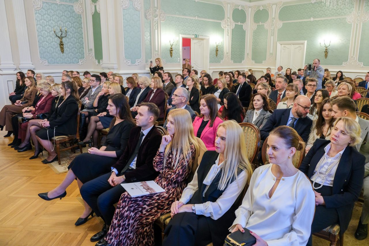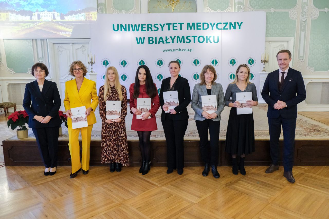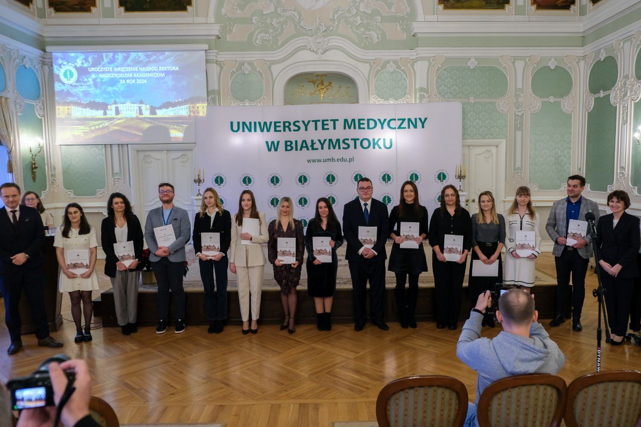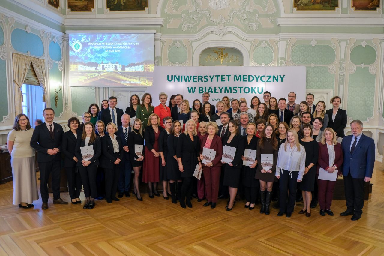 Nagrody za całokształt dorobku, naukowe i dydaktyczne przyznawane pracownikom Uniwersytetu Medycznego w Białymstoku to tradycja, która – jak podkreślają władze uczelni – z roku na rok nabiera wyjątkowej dynamiki. Tylko w tym roku do nagrodzenia zakwalifikowano aż 619 wniosków: 11 o nagrodę naukową za pozyskanie grantu na działalność naukową, 500 wniosków o nagrodę naukową za prace publikowane w czasopismach posiadających współczynnik Impact Factor (IF) i uzyskane patenty, 3 wnioski o nagrodę dydaktyczną za uzyskanie dofinansowania projektu dotyczącego działalności dydaktycznej Uczelni, 96 wniosków o nagrodę dydaktyczną i 9 wniosków o nagrodę za całokształt dorobku. Nagrody już tradycyjnie podczas gali w Auli Magna (9 grudnia 2025 r.) wręczył Rektor UMB prof. Marcin Moniuszko, któremu towarzyszyli prorektorzy: prof. Irina Kowalska, prof. Katarzyna Socha i prof. Adrian Chabowski.