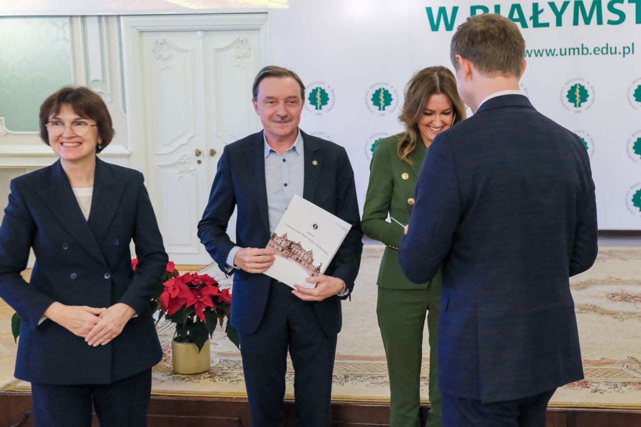 Gratulacje wszystkim zgromadzonym złożył Rektor UMB, prof. Marcin Moniuszko. Podkreślał wartość nauki i pracy zespołowej, która przyniosła znakomite rezultaty badawcze. To rok rekordowy pod względem uzyskanego ze środków zewnętrznych finansowania projektów badawczych, o czym w dalszej części uroczystości mówiły prof. Irina Kowalska i prof. Katarzyna Socha.