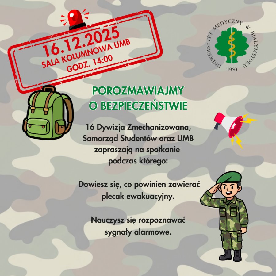 W ramach podpisanej współpracy Uniwersytetu Medycznego w Białymstoku z 16 Pomorską Dywizją Zmechanizowaną zapraszamy wszystkich zainteresowanych — studentów, doktorantów i pracowników — na cykl praktycznych i niezwykle ważnych wykładów i warsztatów poświęconych bezpieczeństwu. To wyjątkowa okazja, by zdobyć wiedzę, która w sytuacjach kryzysowych może realnie pomóc ochronić siebie i swoich najbliższych.