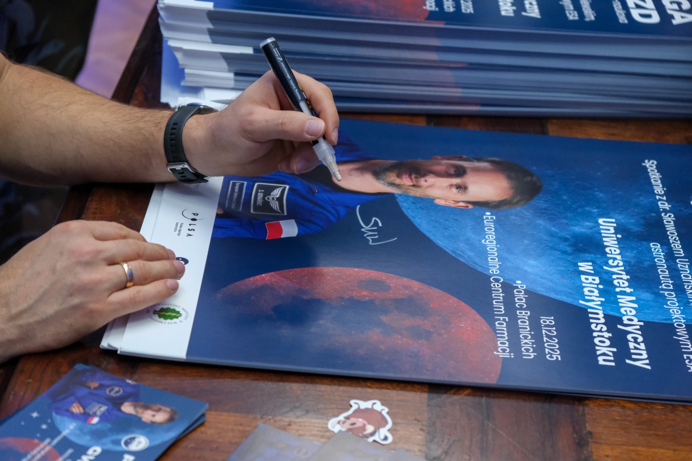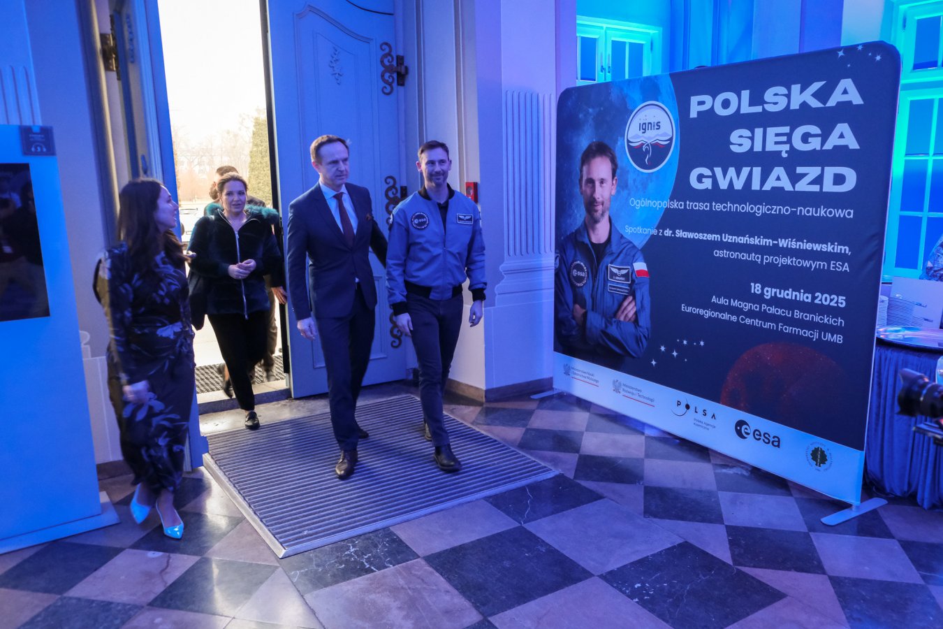 Ponad 600 osób na miejscu i tysiące przed ekranami komputerów, zaskakujące pytania, inspirujące wystąpienia, debata, pokazy naukowe – tak wyglądała wizyta dr Sławosza Uznańskiego-Wiśniewskiego w Białymstoku. W czwartek, 18 grudnia 2025 r., studenci, doktoranci i pracownicy uczelni oraz uczniowie i nauczyciele podlaskich szkół mogli spotkać się w polskim astronautą projektowym Europejskiej Agencji Kosmicznej ESA.