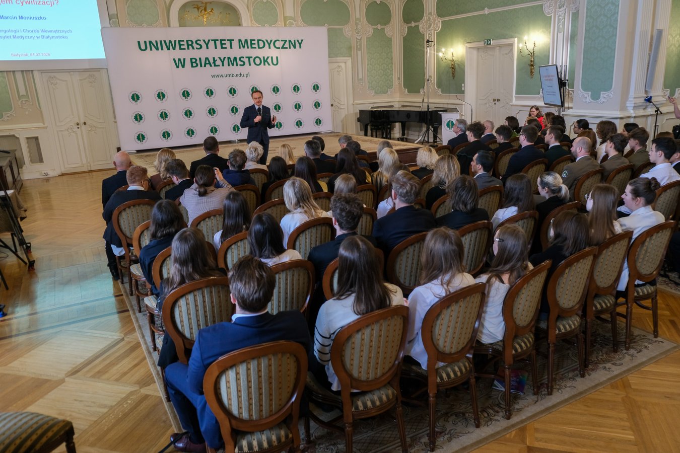 Zanim dyplomy powędrowały do przedstawicieli wyróżnionych szkół, Rektor UMB wygłosił również krótki wykład pt. „Czy organizm ludzki nadąża za rozwojem cywilizacji? Wykład można obejrzeć na YT, w retransmisji z wydarzenia: