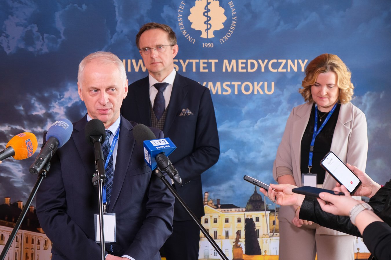 W konferencji udział wzięli: Wojewoda podlaski Jacek Brzozowski, Marszałek województwa podlaskiego Łukasz Prokorym oraz Prezydent Białegostoku Tadeusz Truskolaski.