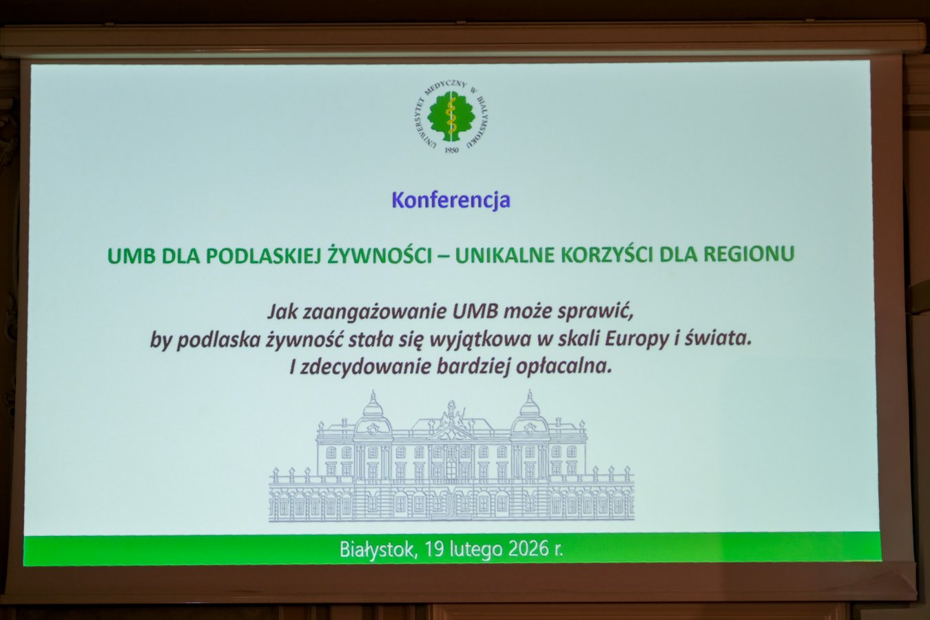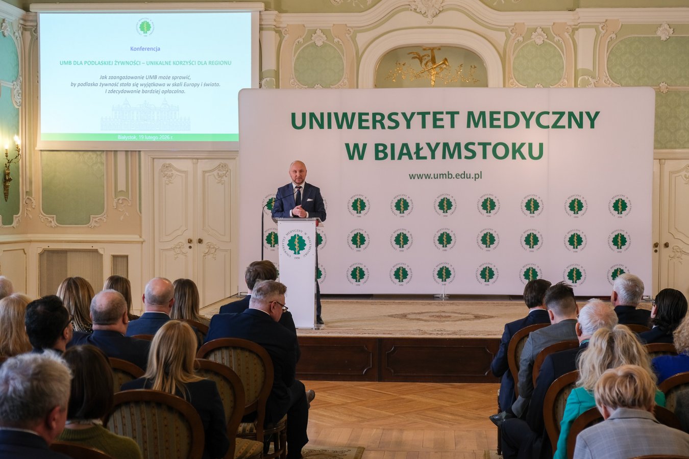 Ponad stu przedstawicieli firm spożywczych, przetwórców, rolników i instytucji otoczenia biznesu, a także reprezentanci władz wojewódzkich, samorządowych i miejskich, spotkali się w Auli Magna Pałacu Branickich na konferencji pt. „UMB dla podlaskiej żywności – unikalne korzyści dla regionu” (19 lutego 2026 r.). Nieprzypadkowo to właśnie dzisiaj, w Dniu Nauki Polskiej, rozmawialiśmy o tym, jak nauka może wspierać biznes, a ten z kolei – tworzyć żywność specjalnego przeznaczenia medycznego, mogącą pomagać np. pacjentom z chorobami metabolicznymi.