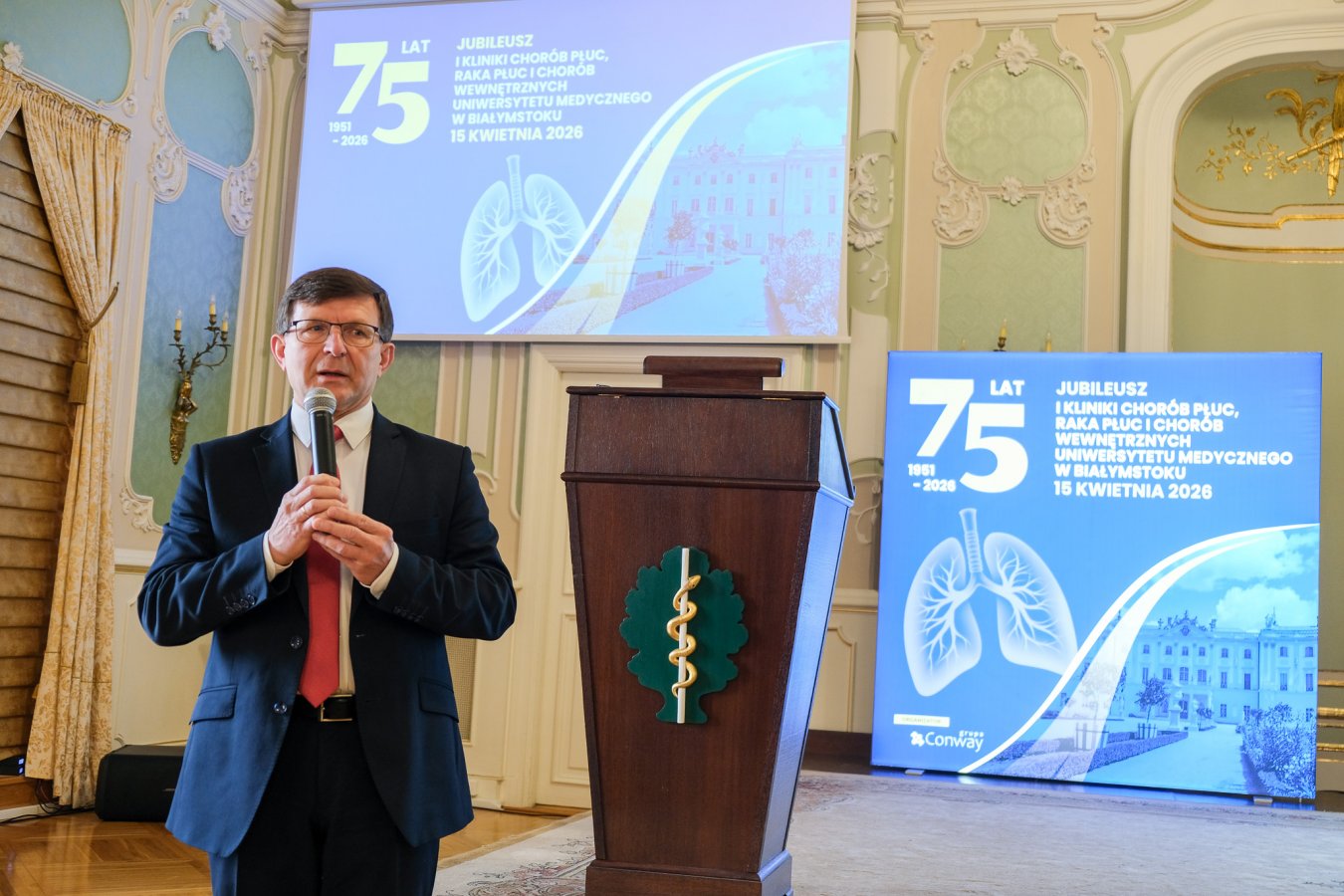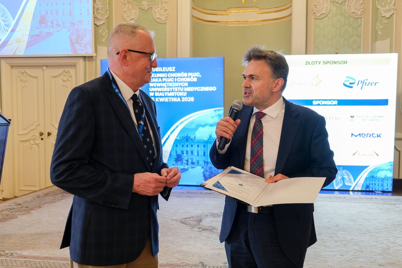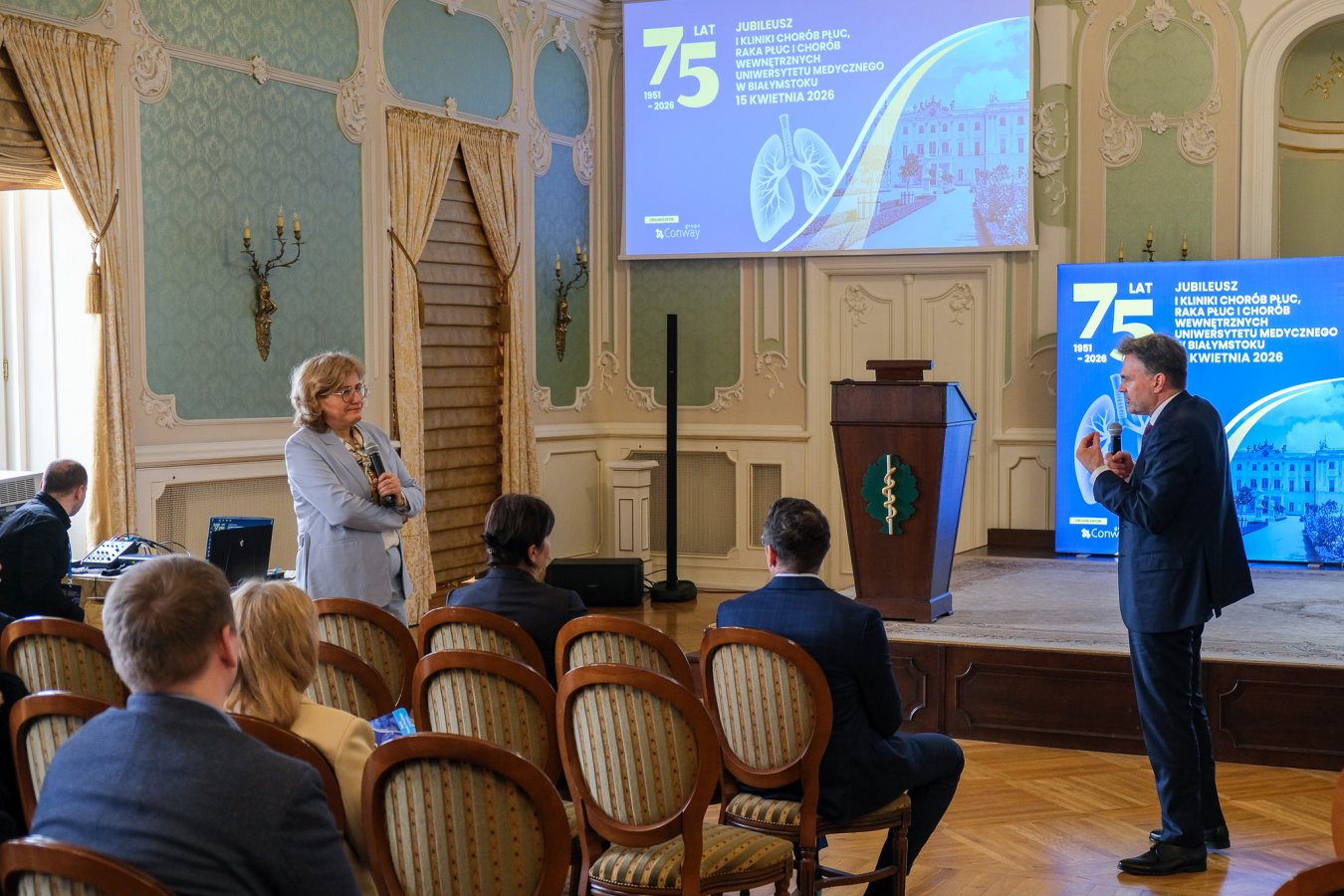 W środę (15 kwietnia 2026 r.) w Auli Magna Pałacu Branickich uroczyście obchodzono jubileusz powstania Kliniki. Z tej okazji zorganizowano konferencję naukową pod tytułem „Pacjent chory na raka płuca w sieci chorób współistniejących - historia, teraźniejszość, przyszłość”. Pierwszy panel spotkania poświęcony został właśnie historii jednostki, ale też ludzi ją tworzących. Pracownicy z najdłuższym stażem zawodowym oraz emeryci, zasłużeni Klinice, zostali wyróżnieni specjalnymi dyplomami.