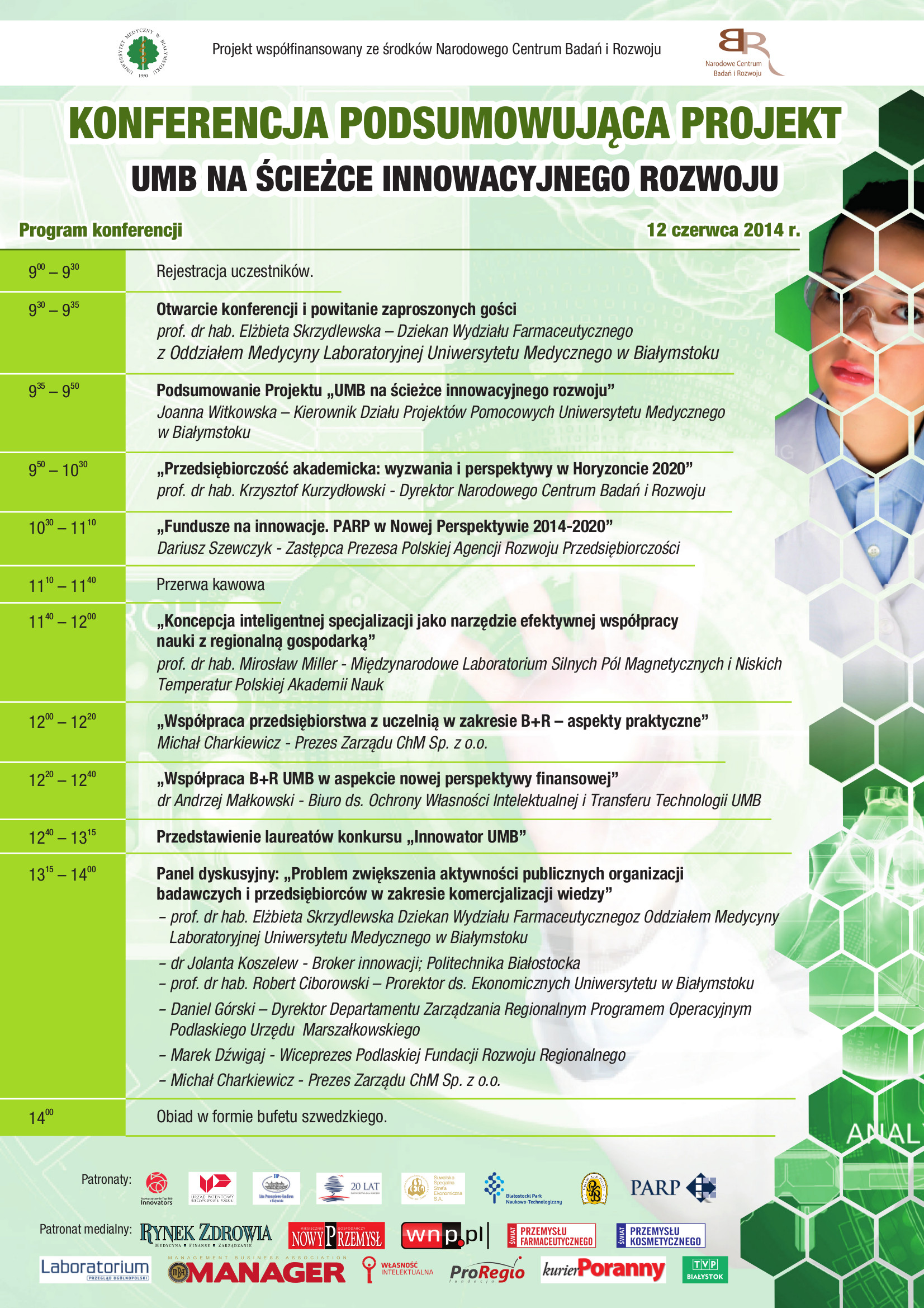Konferencja organizowana jest w ramach projektu "UMB na ścieżce innowacyjnego rozwoju", realizowanego w ramach krajowego programu Narodowego Centrum Badań i Rozwoju "Kreator innowacyjności - wsparcie innowacyjnej przedsiębiorczości akademickiej".