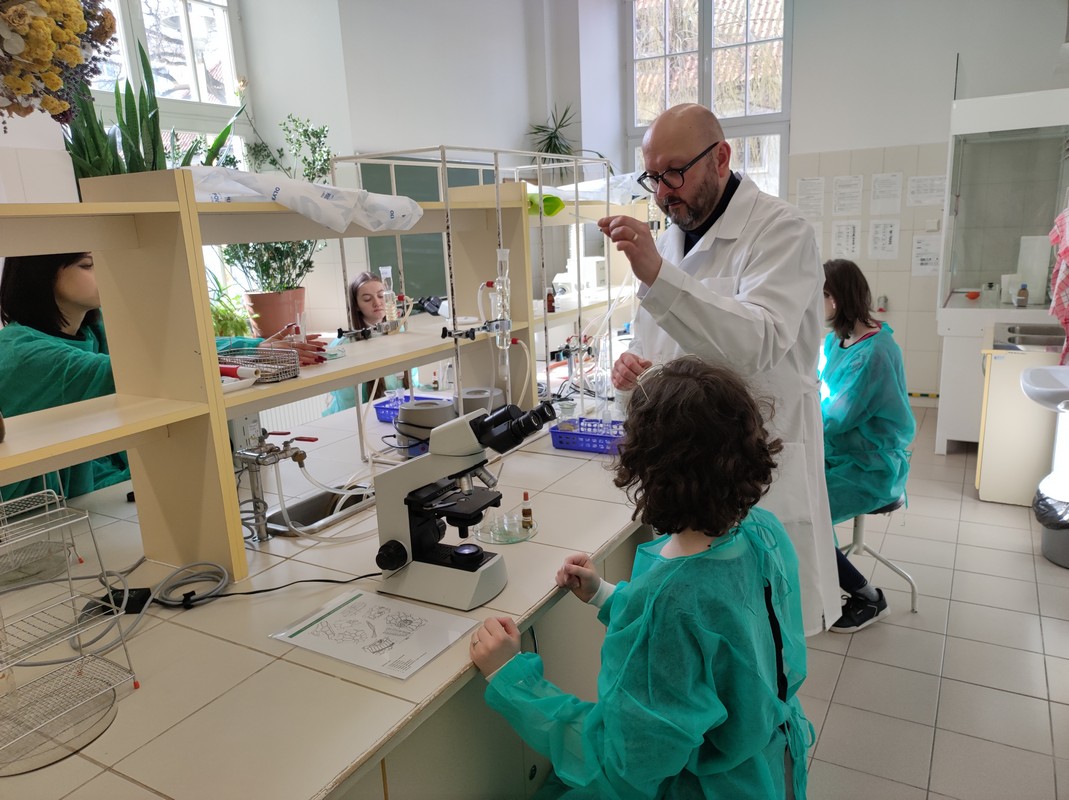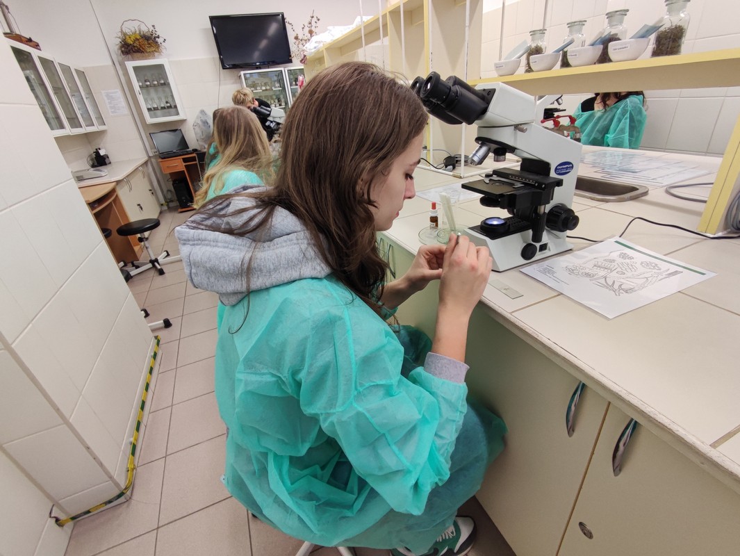 „Pachnące laboratorium” było tematem kolejnych zajęć realizowanych w ramach projektu „Biologia i Chemia po akademicku 2”. 28 i 29 marca 2023 roku dwie grupy licealistów uczestniczyły w zajęciach w Zakładzie Farmakognozji. Kierownik zakładu dr hab. Michał Tomczyk z Bogusławą Jarowisiewcz i Marzeną Staśkiewicz poprowadził niezwykle ciekawe warsztaty podczas których młodzież samodzielnie przygotowywała preparaty mikroskopowe, identyfikowała struktury i miejsca lokalizacji olejków eterycznych w tkance roślinnej. Licealiści zapoznali się z różnymi metodami chemicznymi umożliwiającymi otrzymywanie olejków eterycznych z materiału roślinnego. Podczas warsztatów była też możliwość poznania zapachu wybranych olejków eterycznych. Dr hab. Michał Tomczyk nie tylko pomagał i czuwał przy wykonywaniu preparatów mikroskopowych ale też z pasją opowiadał o niezwykłych właściwościach roślin i odpowiadał na liczne pytania od uczestników zajęć.