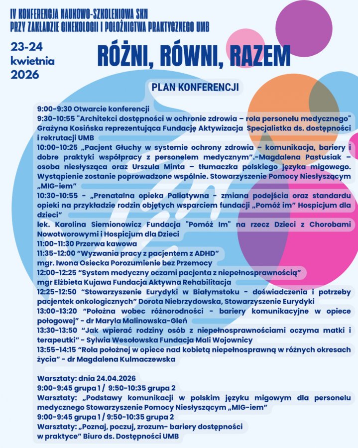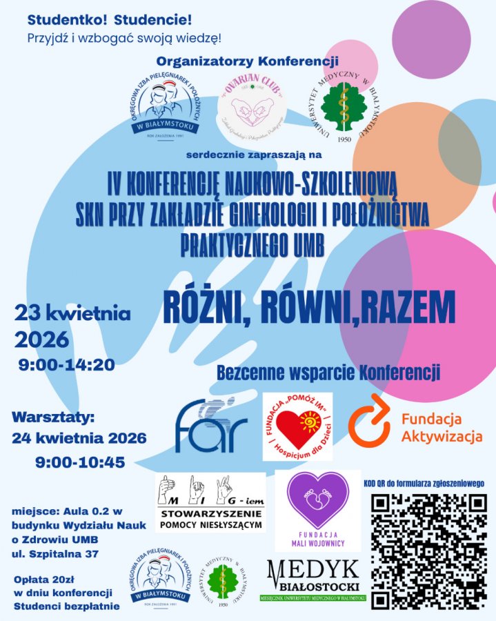 W dniach 23-24 kwietnia 2026 r. bierzemy udział w IV Konferencji Naukowo-Szkoleniowej "RÓŻNI, RÓWNI, RAZEM" organizowanej przez SKN przy Zakładzie Ginekologii i Położnictwa Praktycznego UMB.