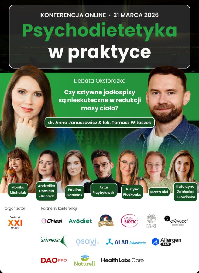 21 marca 2026 spotykamy się online na konferencji Dietetyk XXI Wieku „Psychodietetyka w praktyce” - wydarzeniu dla tych, którzy chcą lepiej rozumieć pacjenta i pracować skutecznie tam, gdzie „samo jedzenie” to za mało.