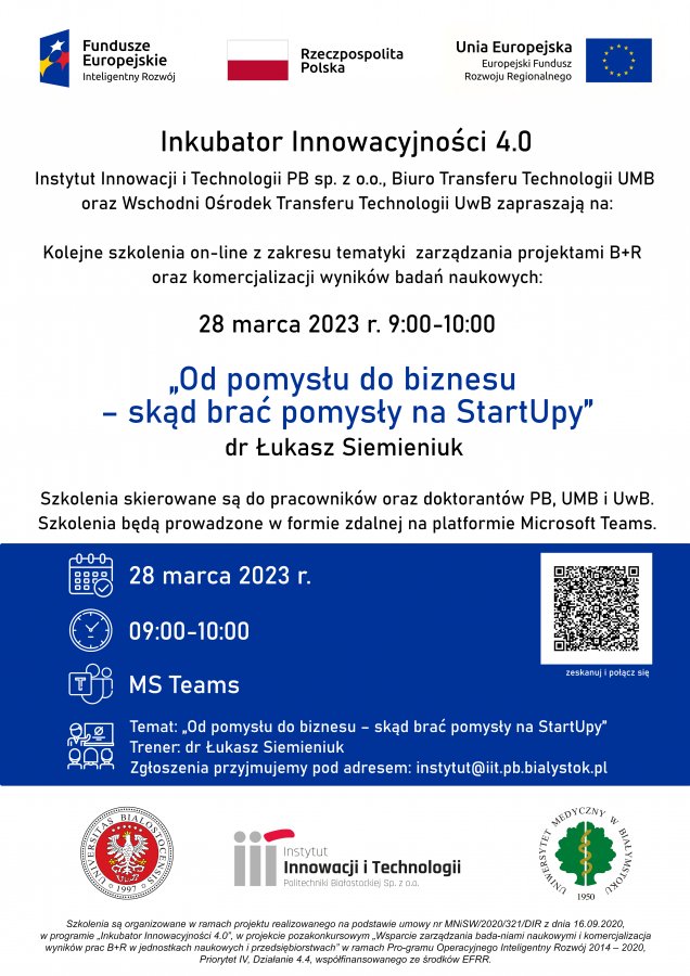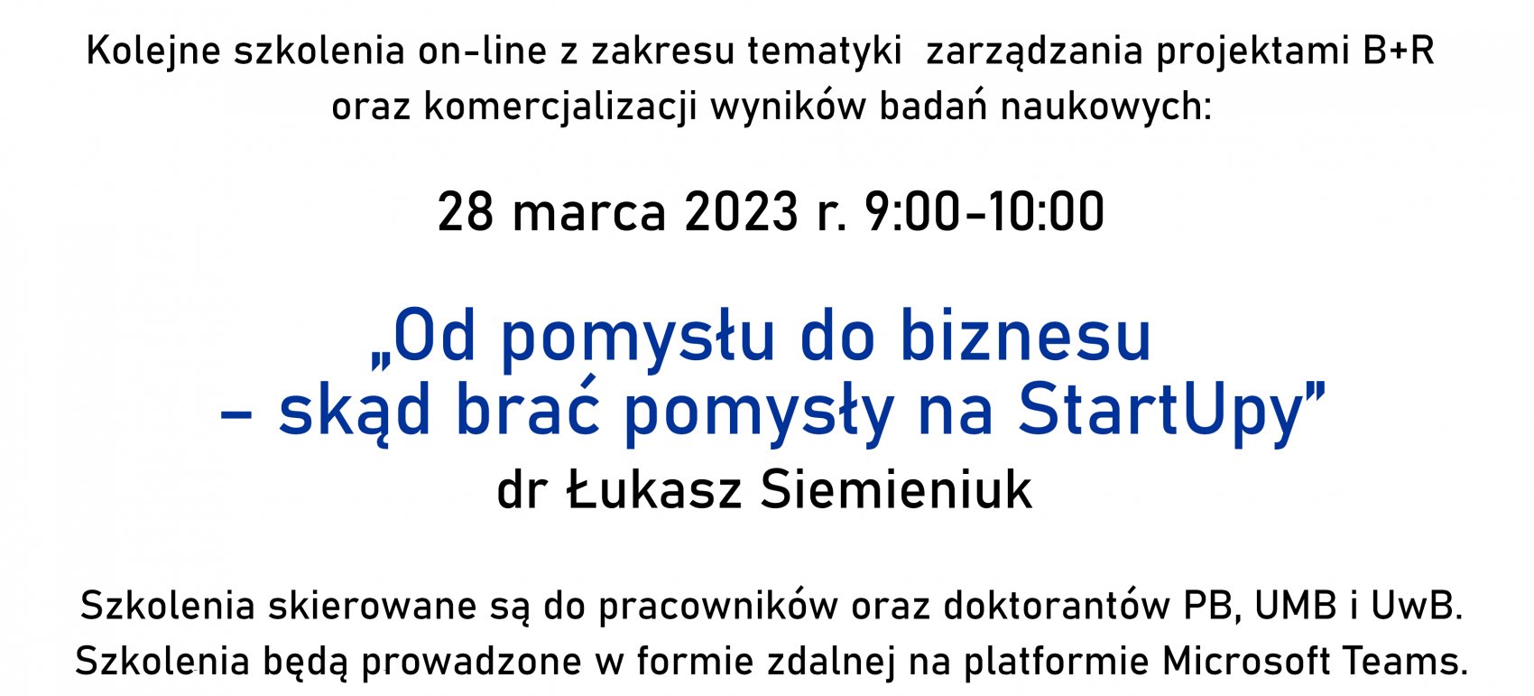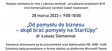 Serdecznie zachęcamy pracowników oraz doktorantów UMB do wzięcia udziału w szkoleniu pt. Od pomysłu do biznesu - skąd brać pomysły na StartUpy.