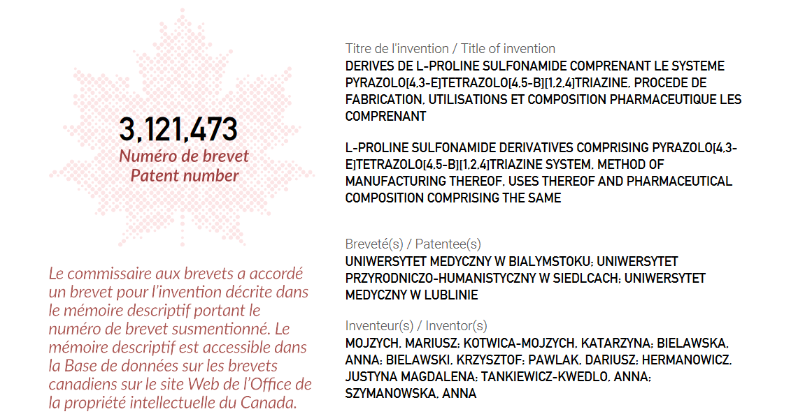 19 września 2023 Kanadyjski Urząd Patentowy opublikował informację o udzieleniu patentu na wynalazek pt. „Derives de L-proline sulfonamide comprenant le systeme pyrazolo[4,3-e]tetrazolo[4,5-b][1,2,4]triazine, procede de fabrication, utilisations et composition pharmaceutique les comprenant” (,,Nowe L-prolinowe sulfonamidowe pochodne zawierające układ pirazolo[4,3-e]tetrazolo[4,5-b][1,2,4]triazyny, sposób ich wytwarzania, ich zastosowania oraz kompozycja farmaceutyczna je zawierająca”).
