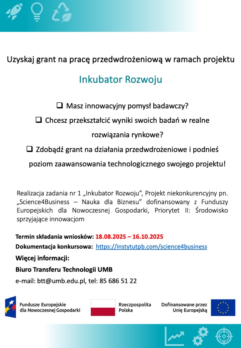 Z przyjemnością informujemy, że od 18 sierpnia 2025 r. rozpoczyna się nabór wniosków w ramach projektu „Inkubator Rozwoju” (Zadanie 1 w projekcie Science4Business – Nauka dla Biznesu).