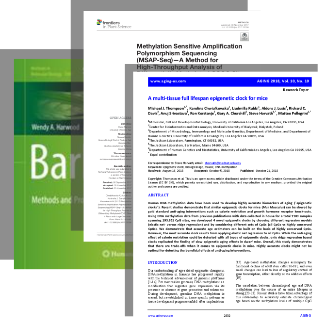 • Thompson MJ, Chwiałkowska K, Rubbi L, Lusis AJ, Davis RC, Srivastava A, Korstanje R, Churchill GA, Horvath S and Pellegrini M (2018), "A multi-tissue full lifespan epigenetic clock for mice", Aging (Albany NY). Vol. 10(10), pp. 2832. Impact Journals, LLC. [doi]