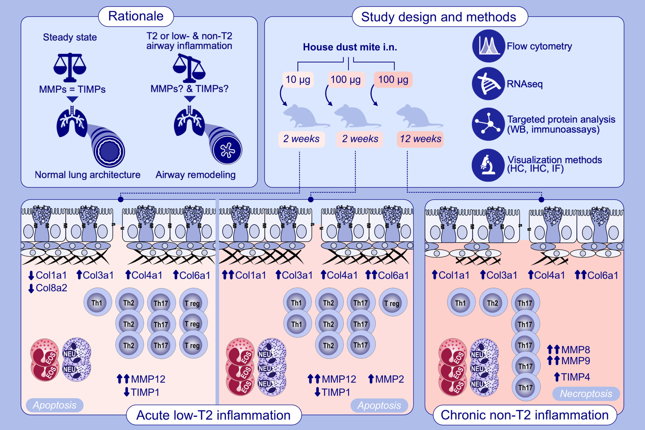 W pracy przedstawiono kompleksową analizę mechanizmów przebudowy dróg oddechowych w doświadczalnych modelach astmy indukowanej ekstraktem roztoczy kurzu domowego (HDM). Badanie ujawnia różne ścieżki molekularne i komórkowe odpowiedzialne za przebudowę dróg oddechowych w zależności od fenotypu zapalnego (T2-low).