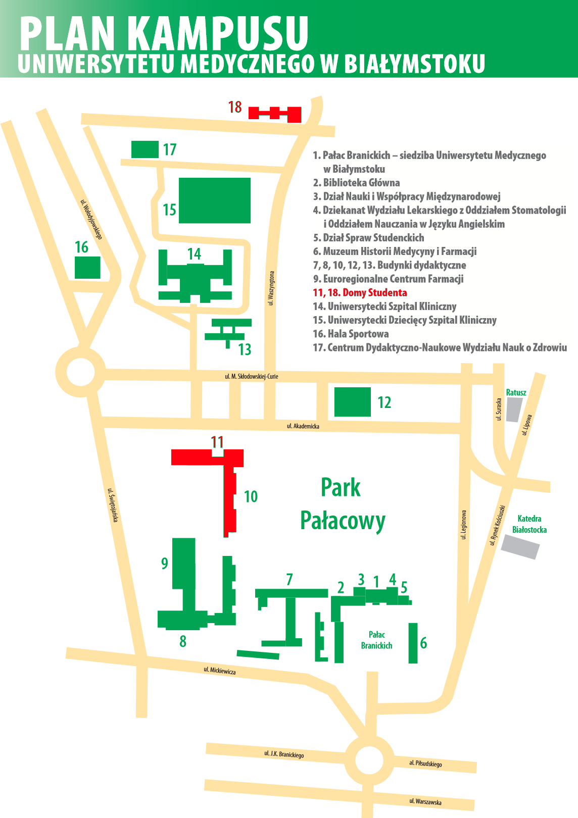 Uniwersytet Medyczny w Białymstoku dysponuje dwoma Domami Studenta, położonymi w centrum Białegostoku oferującymi miejsca dla studentów i pokoje hotel