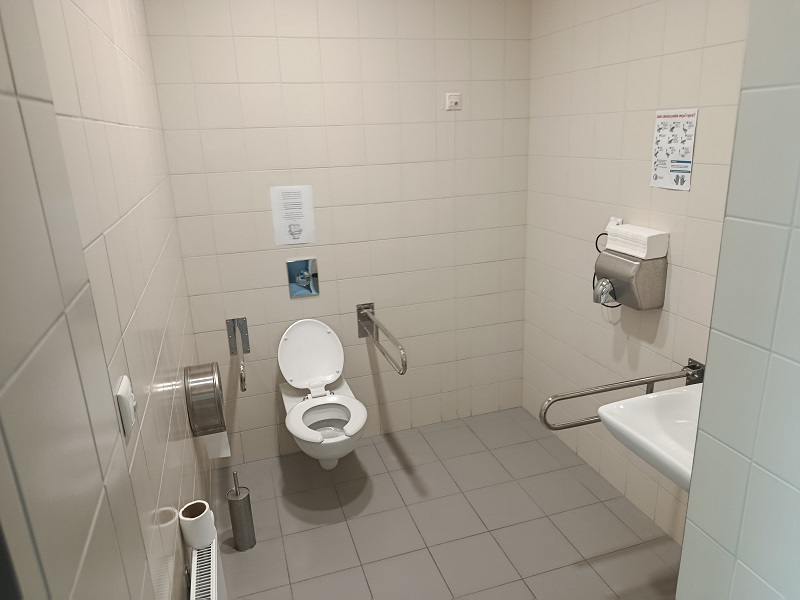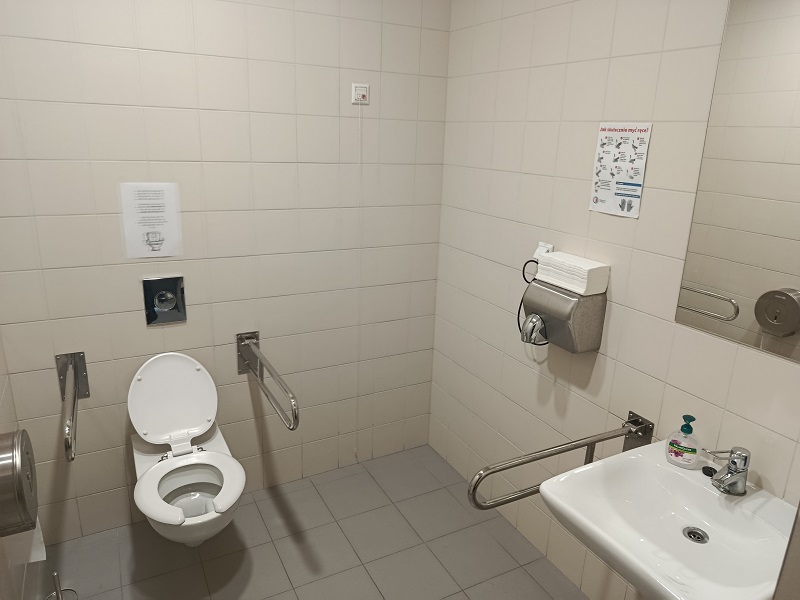 Toalety dla osób z niepełnosprawnościami znajdują się na parterze i pierwszym piętrze. Są identyczne. Obydwie zostały oznaczone piktogram osoby na wózku. Drzwi do toalet mają szerokość 0,95 m, ich otwarcie nie wymaga znacznej siły. Toaleta ma przestrzeń manewrową około 2,0 x 2,0 m, transfer na miskę ustępową w obu toaletach z prawej strony. Miska ustępowa i umywalka wyposażone obustronnie w pochwyty.