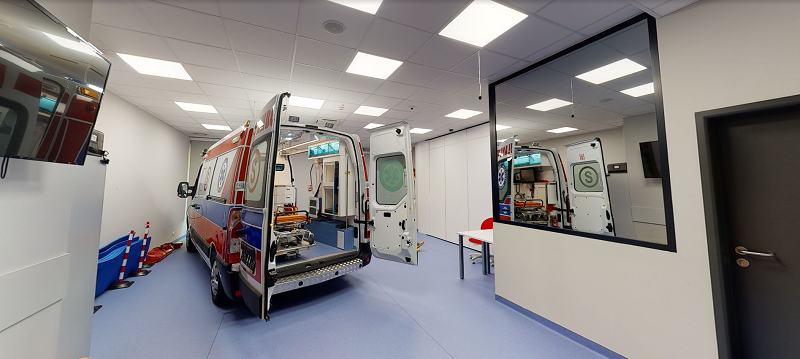 Symulator Karetki znajduje się na parterze po lewej stronie z holu głównego. Drzwi do niej mają szerokość około 1,20 m, nie mają progu. Drzwi nie otwierają się automatycznie, ale ich otwarcie nie wymaga dużej siły.