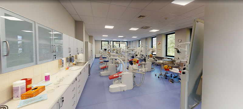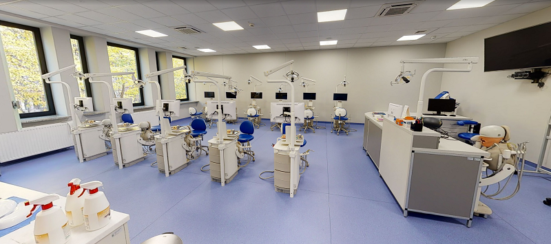 Na poziomie pierwszego piętra znajdują się pomieszczenia biurowo-administracyjne i sale symulacyjne stomatologiczne: