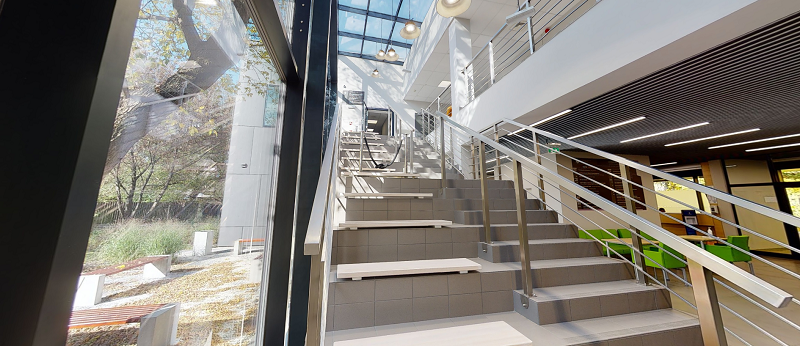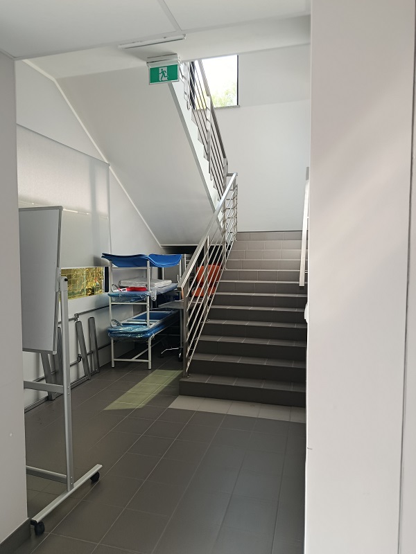 Schody o szerokości 1,20 m prowadzą z parteru na pierwsze piętro. Stopnie posiadają antypoślizgowe krawędzie (ryflowane). Poręcze znajdują się po obu stronach biegu.