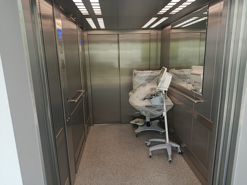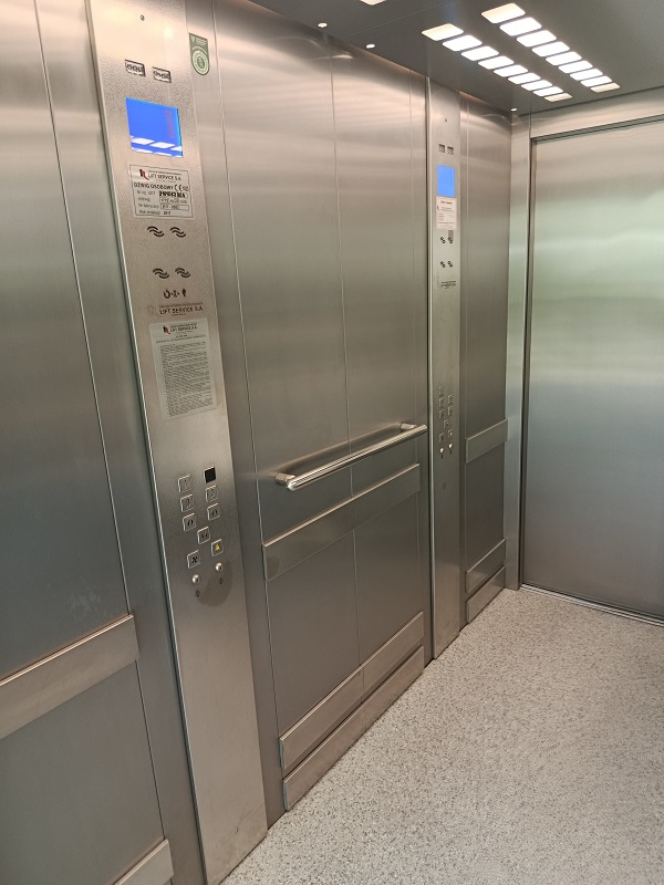 Winda posiada dwa wejścia na parterze i jedno na piętrze. Obsługuje obydwie kondygnacje (parter i piętro). Na parterze kabina windy jest przelotowa, wejścia do niej znajdują się po prawej stronie holu. Winda jest wyposażone w świetlny komunikat przyjazdu oraz informację dźwiękową o otwieraniu się drzwi. Tablice przyzywowe mają wypukłe oznaczenia. Drzwi do kabiny mają 1,30 m szerokości, otwierają i zamykają się automatycznie. Kabina ma wymiary 1,6 x 2,5 m. W środku znajdują się poręcze, nad jedną z nich lustro. W windzie znajdują się dwa wewnętrzne panele sterowania z oznaczeniami dotykowymi i przyciskiem alarmowym.